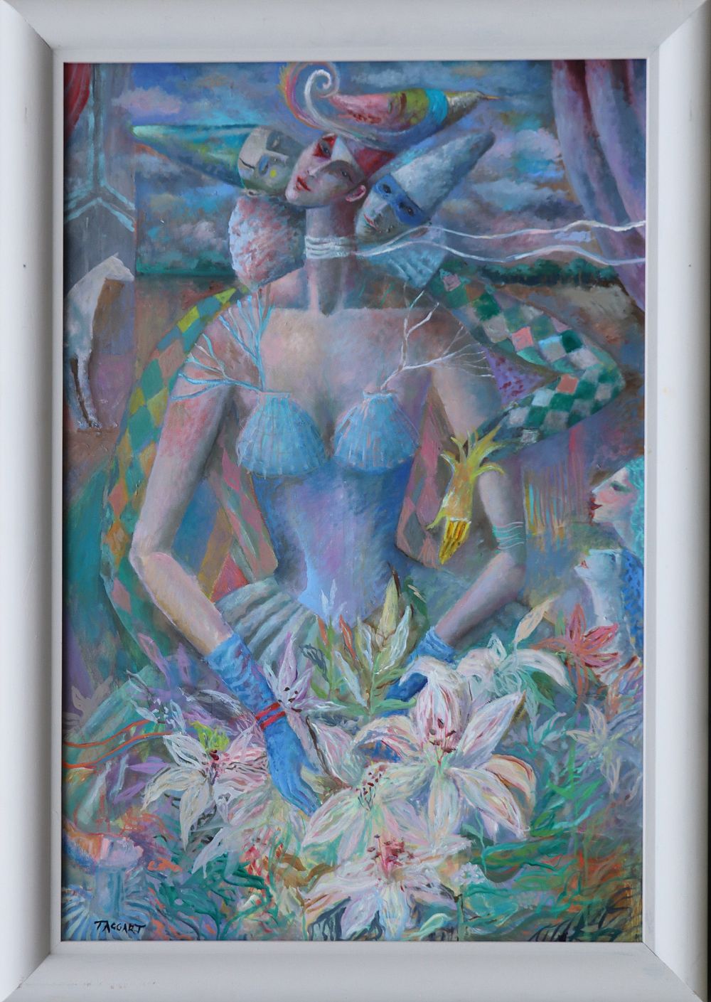 This is a Large oil on canvas by Elizabeth Taggart (Born 1943). Irish artist Elizabeth Taggart is renowned for her flamboyant style and meticulous attention to detail. She studied at the Belfast College of Art and claims Ireland, its culture, landscape and people, to be her main inspiration. Another influence upon the artist’s work comes from travelling to places such as Mexico, India and Portugal, drawing upon the religious and pagan imagery so prevalent here. This painting titled ‘The Trio with Lillies’ is a large example of her work and makes for a very striking view. Signed lower left and on the verso.