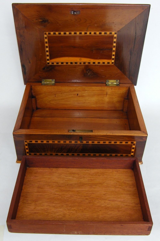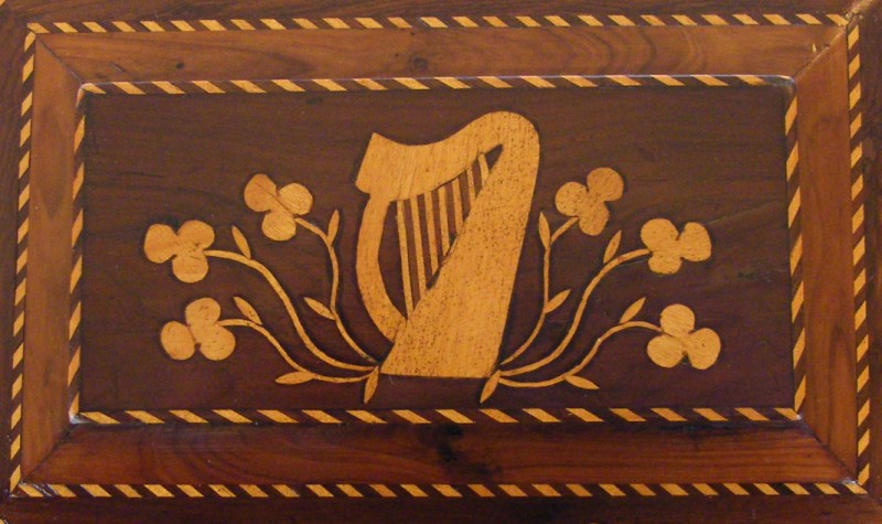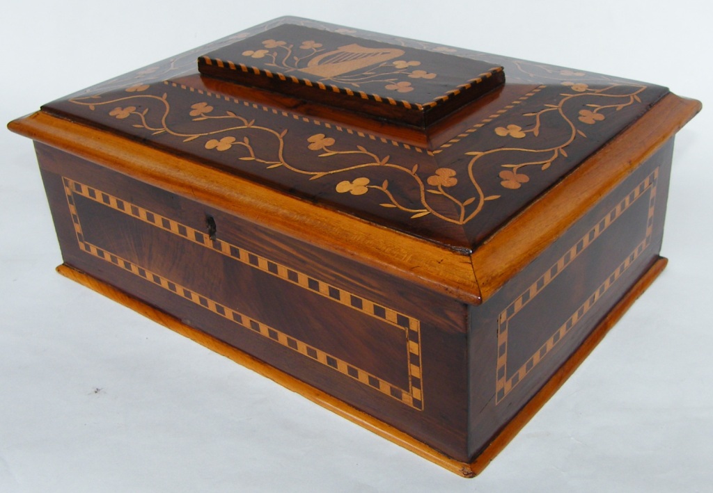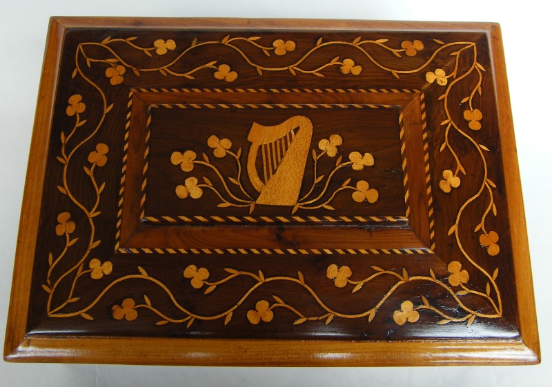 Mid Nineteenth Century. The domed shaped lid with a central rectangular tablet, both lavishly inlaid with Irish Shamrocks and a central Harp. Condition: This piece has been professionally restored, original firm hinges, lock is present key is lacking.