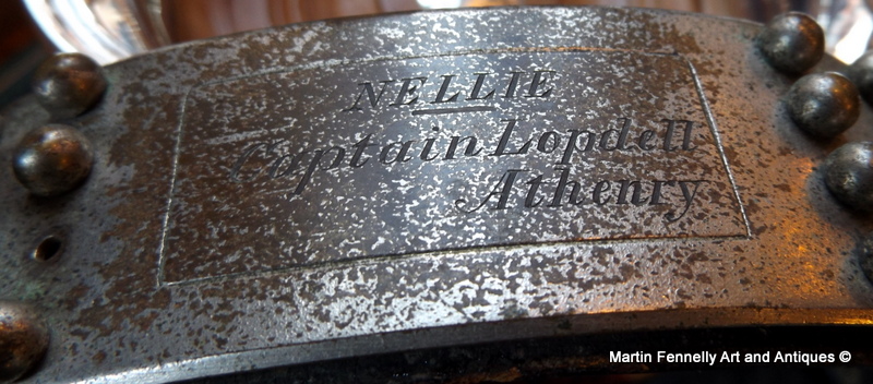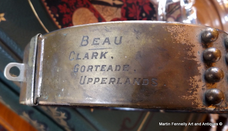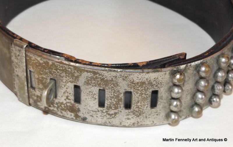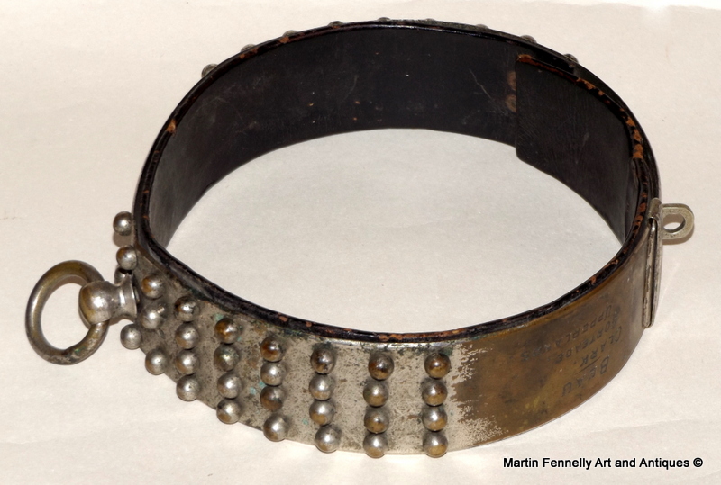 This has to be one of the rarest items I ever had in store. This Dog Collar was worn by a Dog called "Nellie" which was owned by Captain Lopdell in Athenry Co. Galway in the West of Ireland. Captain Lopdell owned a large estate near Athenry and lived in Raheen Hose near the town. We can date the Collar to this date as there are many recorded reports of Captain Lopdell around this date. The Collar has also a second engraving which may refer to a previous dog owned by the family. The original leather is present and there is a stud or two missing but overall in pretty good shape.