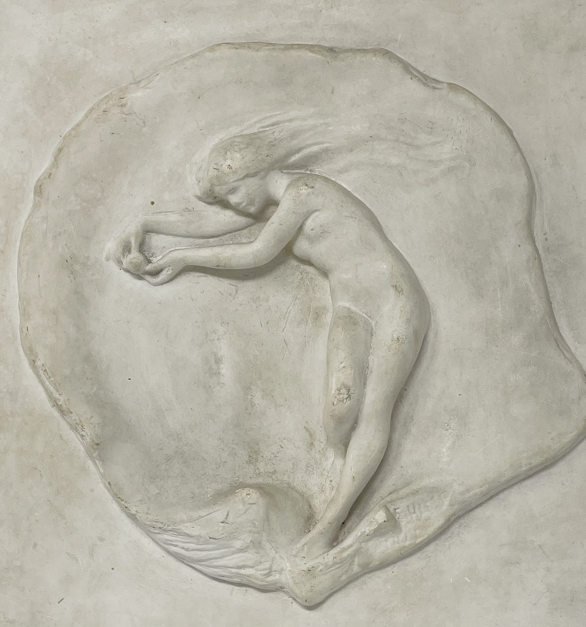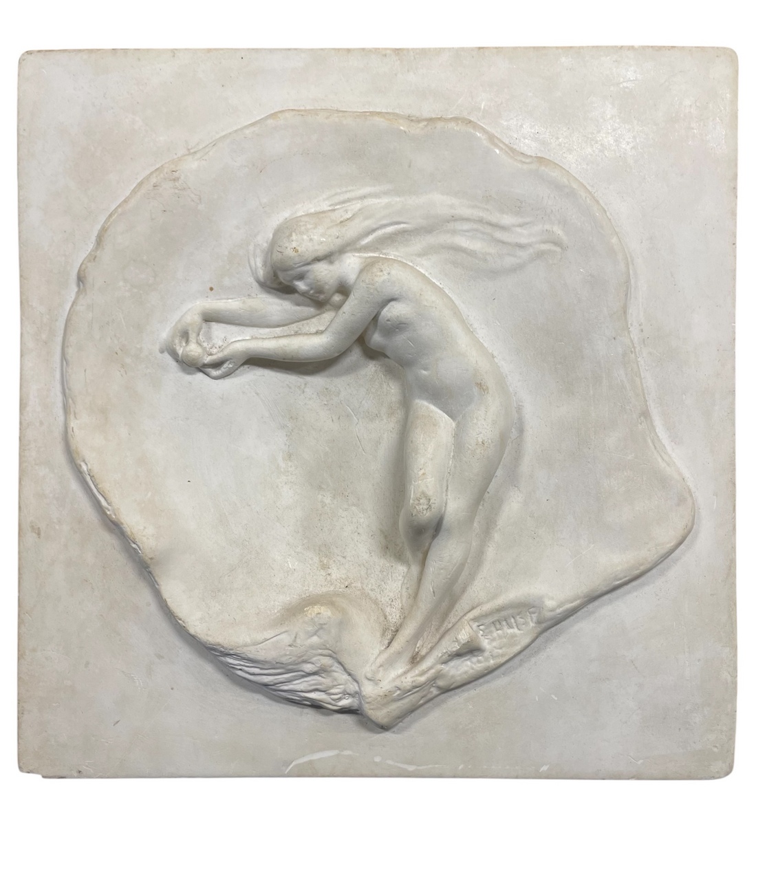 This is a rare Ceramic Plaque by Emmeline Harris (1853-1930) Nude with Ball – The Plaque is signed and dated 1917 – Harris was Born in London and renowned for her depiction of mythological subjects. She was a frequent exhibitor of such works at both the Royal Academy and in Paris during the late nineteenth century. This plaque with a graceful Art Nouveau lady playing with a ball is typical of her work.