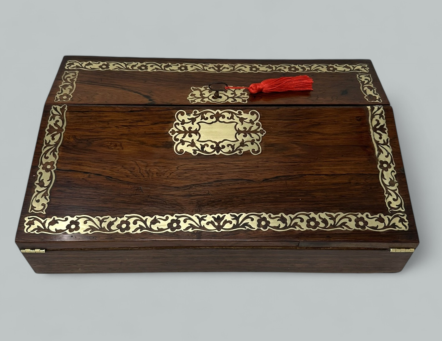 The entire main area with lavish brass inlay on well figured Rosewood opening to reveal an original fitted interior. Complete with its original twin handle carry brass handles