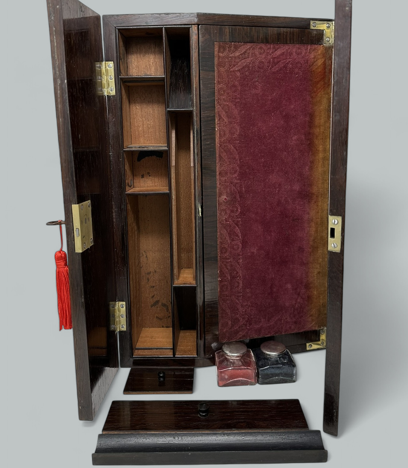 Lock and key are present and working, very slight evidence of shrinkage where top lift panels meet. All brass inlay is present. Both ink bottles are original.