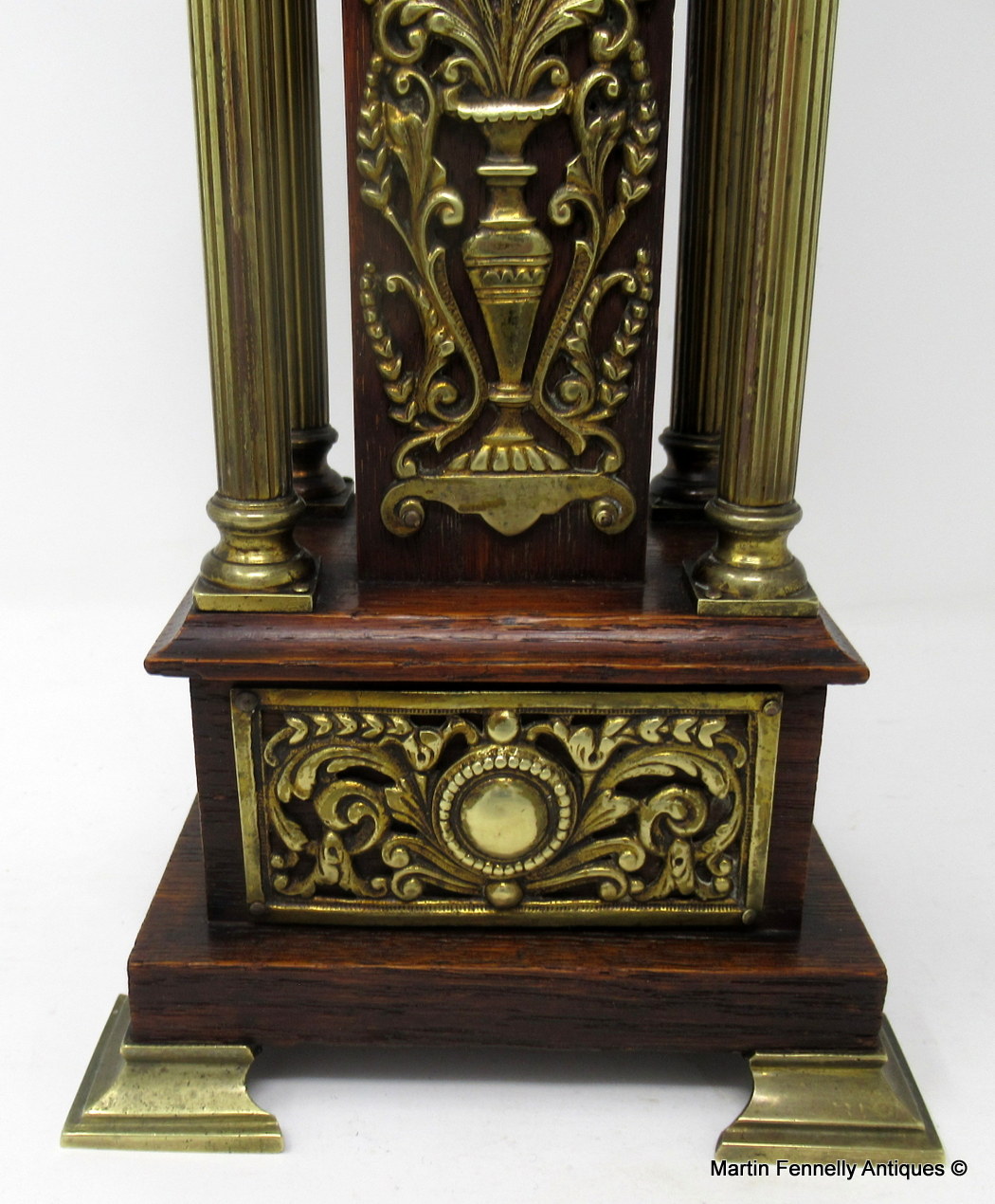 The central main support with lavish cast polish brass mounts depicting an urn with scrolling foliage, flanked by four reeded brass columns. The pediment with a centered brass finial and further applied brass decoration.The plain polished brass bezel with flat circular enamel dial showing Roman Numerals and steel spade hands. Good quality unmarked eight-day mechanical movement. Last quarter of the Nineteenth Century.