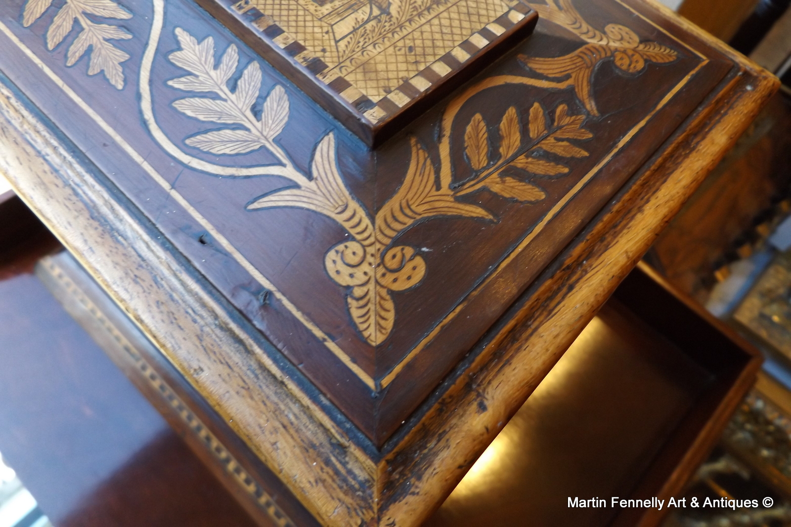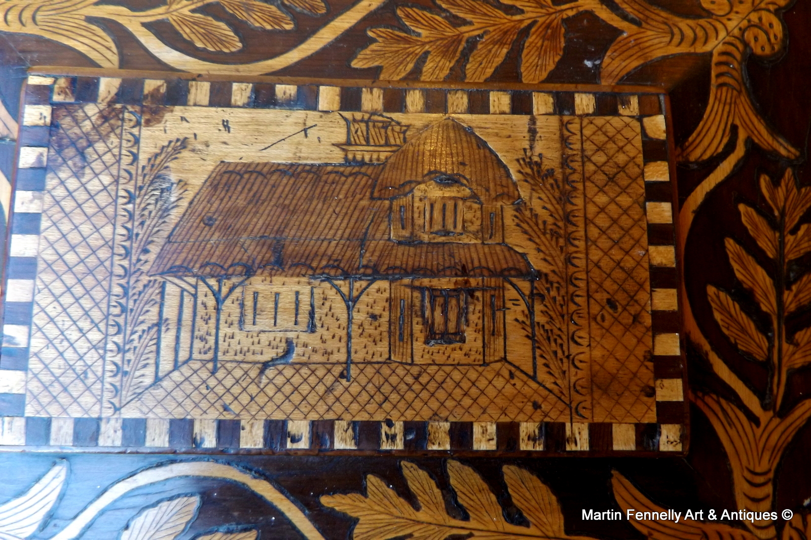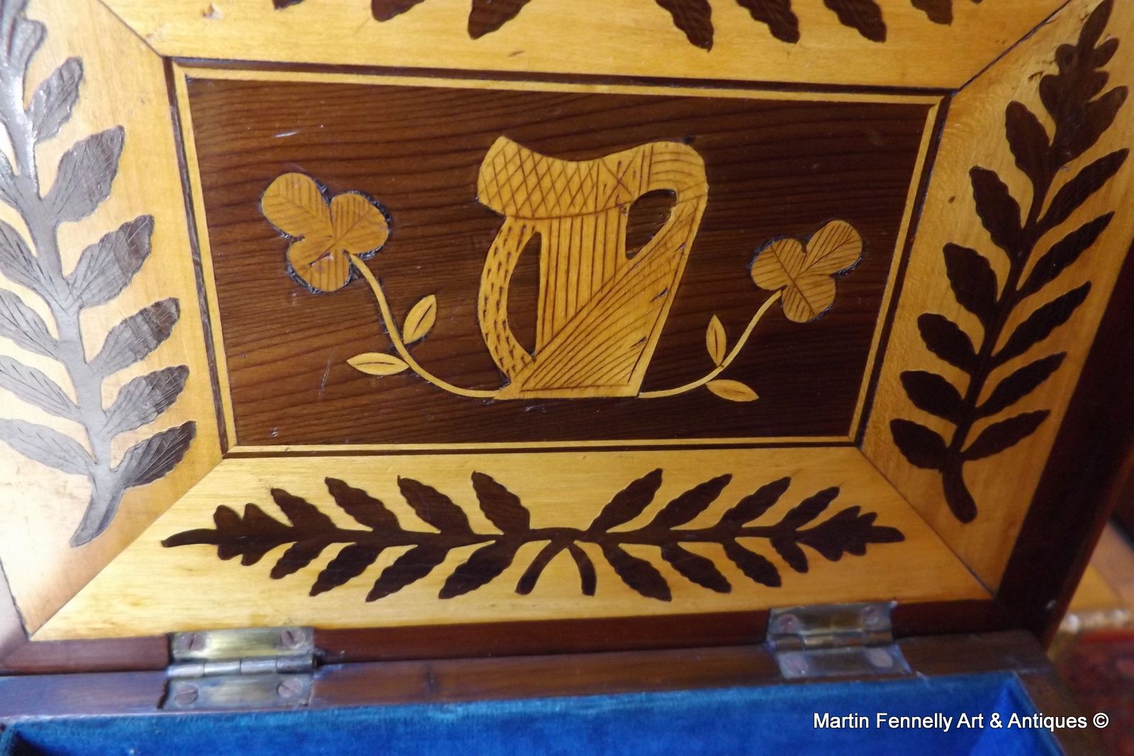 This Twin Door Cabinet is one of the Rare items that one finds in Killarney Wear, dating to Circa 1870 and is in Good Condition. It has the full array of Irish Imagery that you would expect on a Premier piece of Killarney with Shamrocks, Ferns, Harp,The Cottage and Ruins at Muckross. The Twin doors open to reveal a three Drawer interior with Shamrock and Thistle inlay. The top opens to reveal a velvet lined storage interior. This is a sweet piece of Irish History and it will find a good home with one of my clients. The Condition is good and I only like to stock the better quality Killarney Pieces (i regularly refuse poorer quality pieces so rest assured the Killarney at Martin Fennelly Antiques is the Premier Antique Irish Pieces – If you have a piece and need advice please don’t hesitate in making contact with me)
