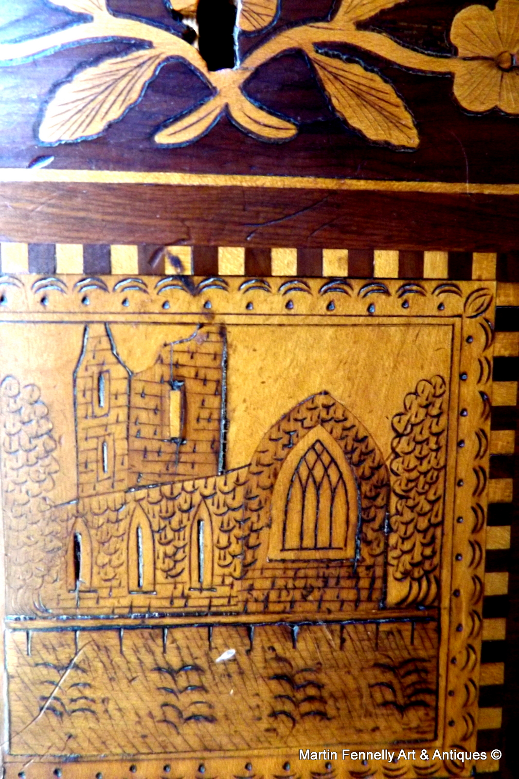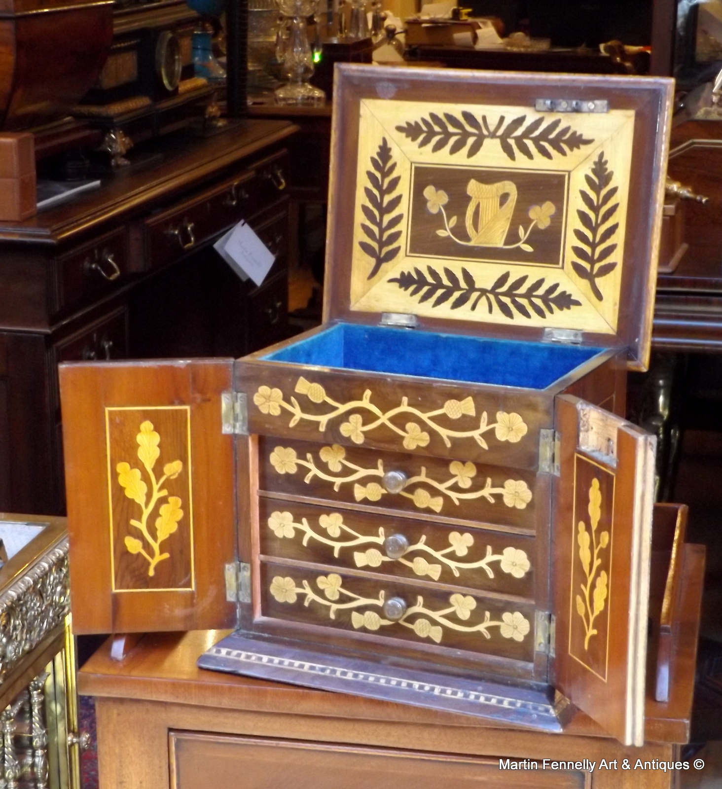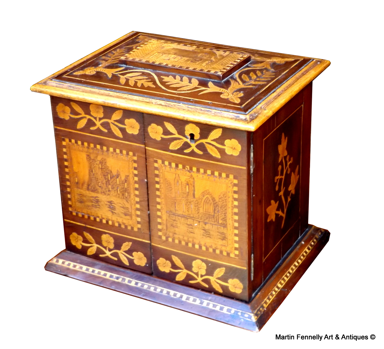 This Twin Door Cabinet is one of the Rare items that one finds in Killarney Wear, dating to Circa 1870 and is in Good Condition. It has the full array of Irish Imagery that you would expect on a Premier piece of Killarney with Shamrocks, Ferns, Harp,The Cottage and Ruins at Muckross. The Twin doors open to reveal a three Drawer interior with Shamrock and Thistle inlay. The top opens to reveal a velvet lined storage interior. This is a sweet piece of Irish History and it will find a good home with one of my clients. The Condition is good and I only like to stock the better quality Killarney Pieces (i regularly refuse poorer quality pieces so rest assured the Killarney at Martin Fennelly Antiques is the Premier Antique Irish Pieces – If you have a piece and need advice please don’t hesitate in making contact with me)