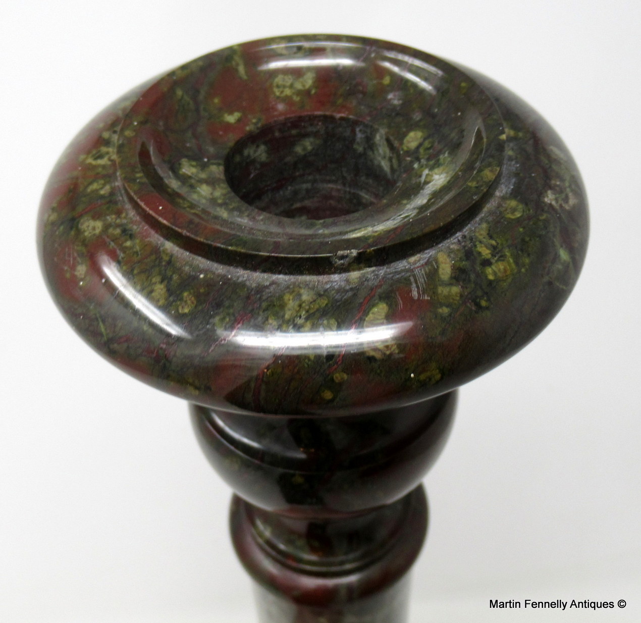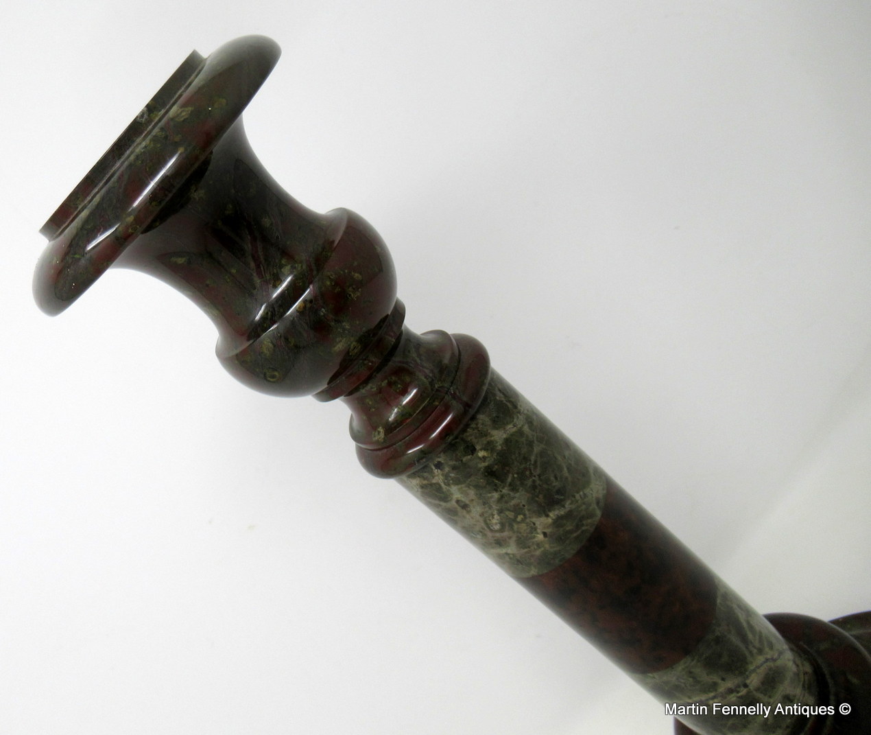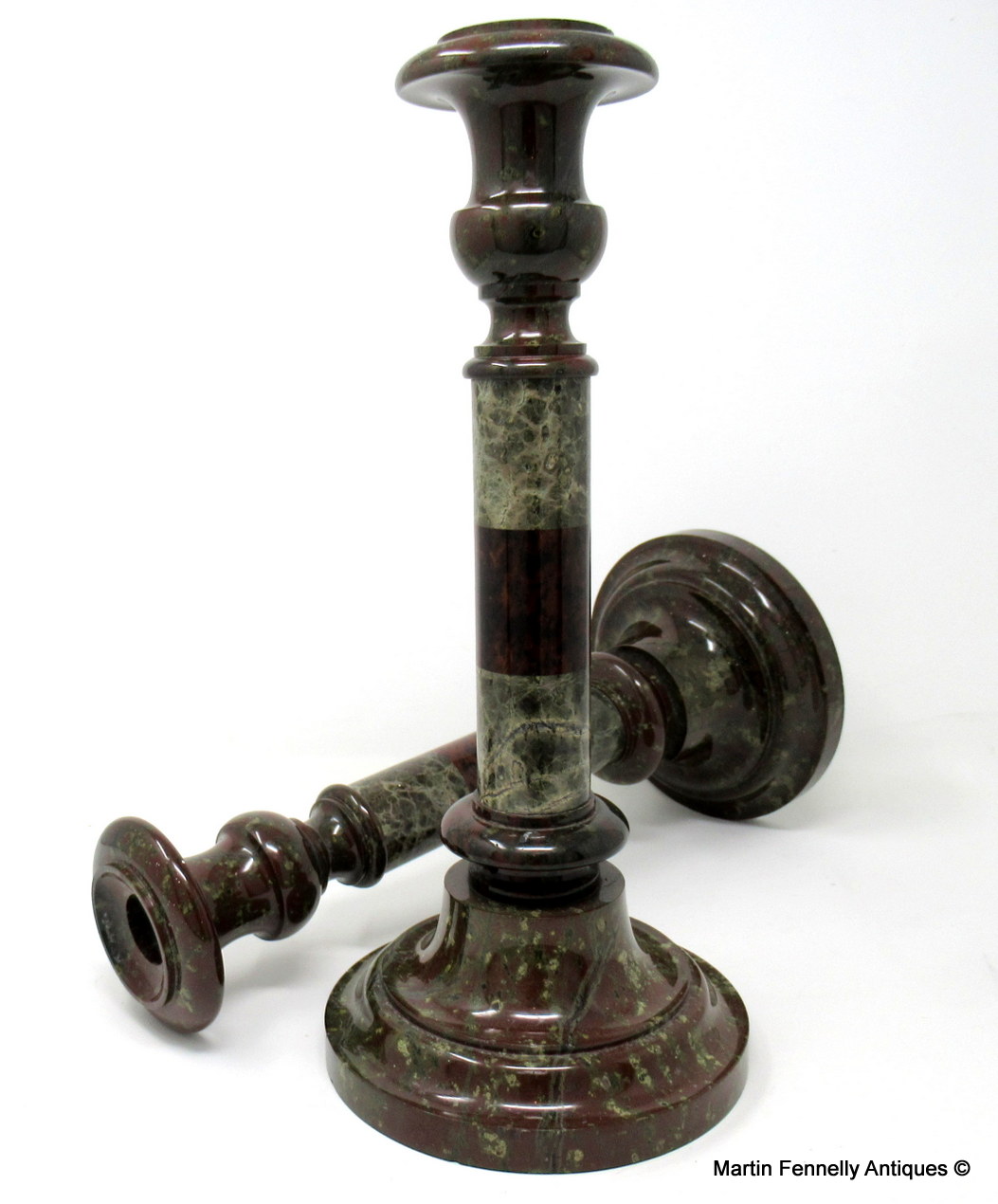These candlesticks can be attributed to Irishman John Murphy who ran a Serpentine Repository in the Market Place, Penzance, Cornwall, England, during the middle of the 19th century.