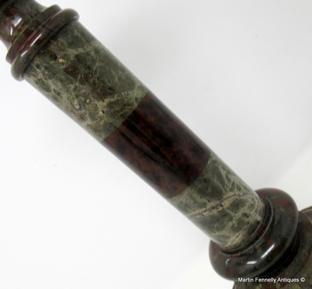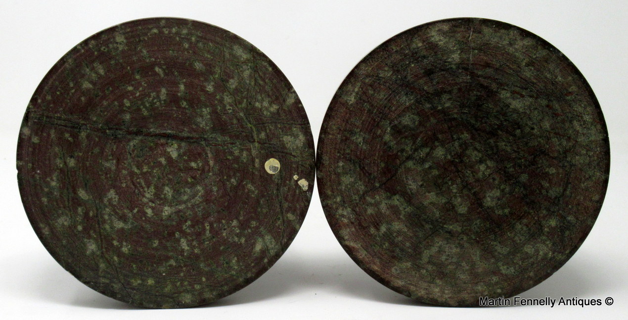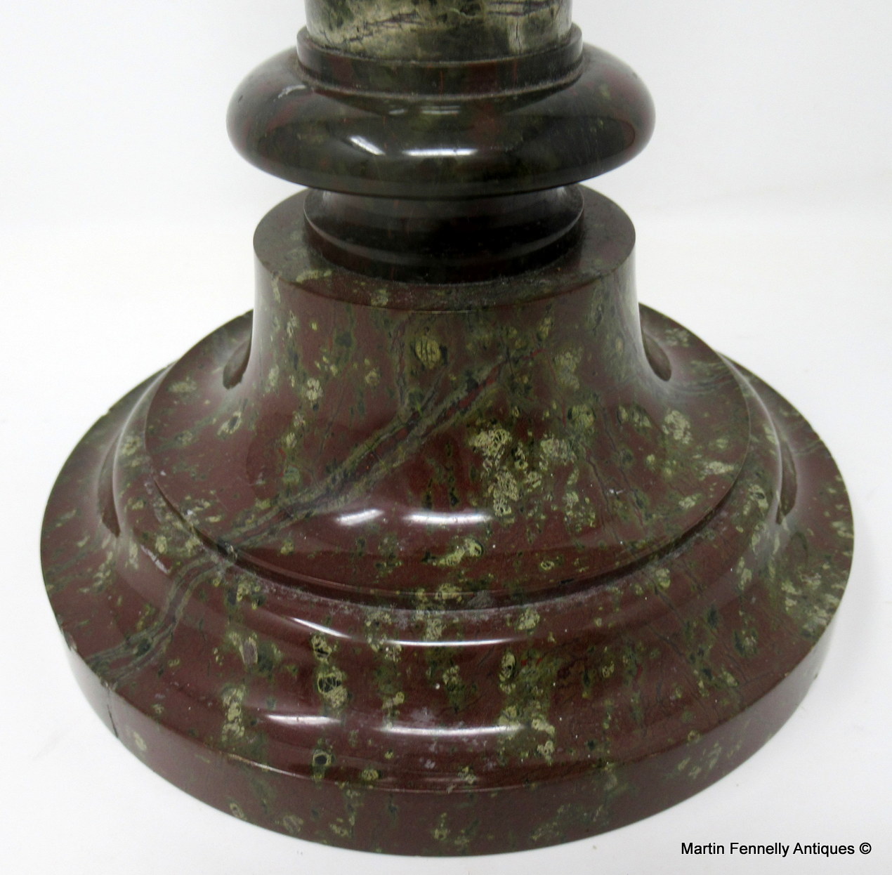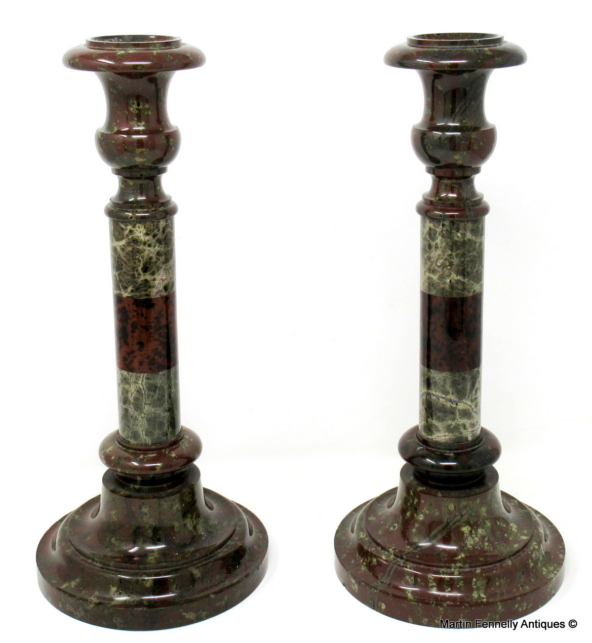 These candlesticks can be attributed to Irishman John Murphy who ran a Serpentine Repository in the Market Place, Penzance, Cornwall, England, during the middle of the 19th century.