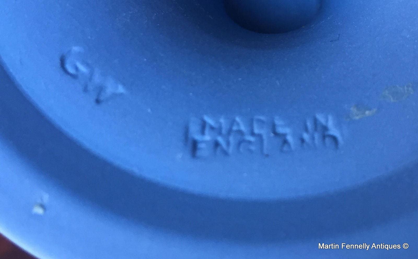 A Pair of Wedgwood Blue Jasperware Arcadian vases featuring white applied depictions of neoclassical figures around a sacrifice bowl on one side and figures around cupid on a pedestal on the other, both scenes separated by trees, and all finished with a repeating band of white applied leaves border underneath. The Artist initials are also present.