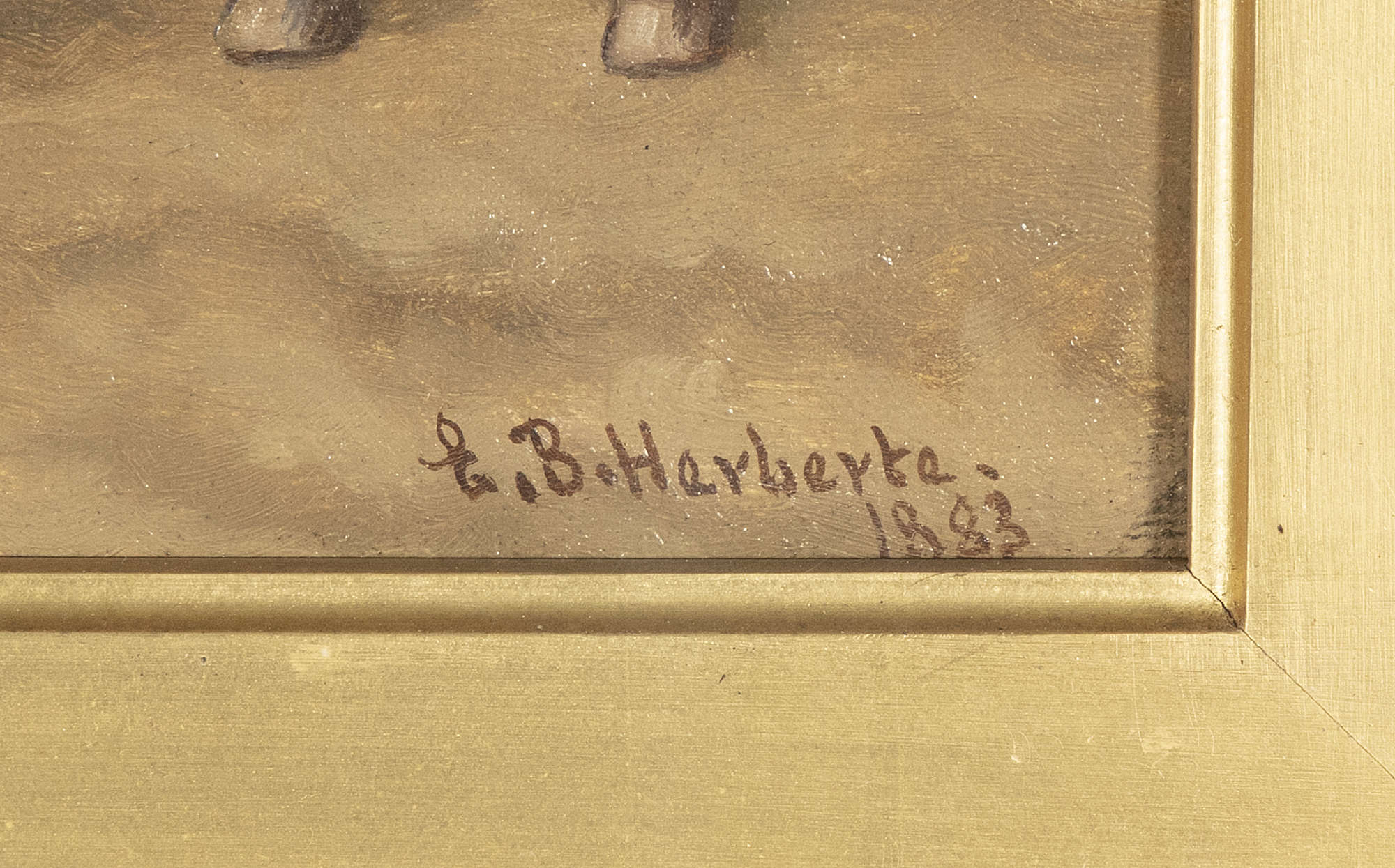 These are a very beautiful Pair of Oil on Canvas by Edward Benjamin Herberte (1857-1893) – ‘The Jump’ and ‘The Meet Up’ – Framed in original Victorian Gilt Frames. Edward Benjamin Herberte was a sporting painter from England who was born in 1857. He primarily painted for private commissions and never exhibited in London. Herberte was known for his spirited depictions of hunting and horse racing, and was one of the first artists to depict women riding in sporting settings. Tne Meet Up Painting (one of the pair on sale here) depicts a Lady riding side saddle and this is rare for old paintings. He died in 1893.