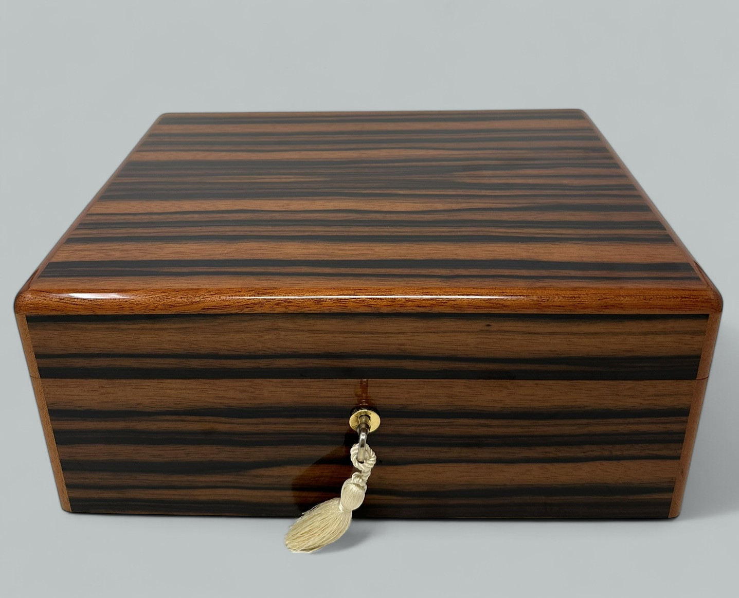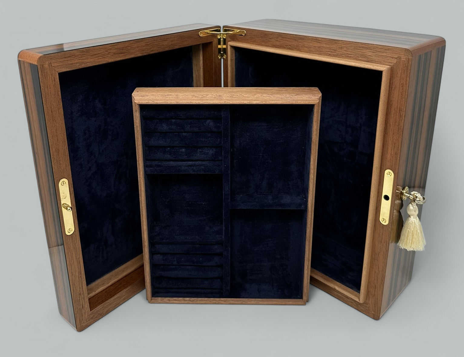 The Best Jewellery Boxes in The World – Rare Macassar Ebony Veneer – Manning of Ireland – Irish Made – This was manufactured by the Famed Manning of Ireland Company and is truly a Jewel of Handcrafted Genius. This Box is constructed of the Finest Woods available and the Knowledge and Skill of 4 Generations of Box making in the Manning family is obvious. The Box is in the very rare Macassar Ebony and enhanced with a hand polished finish. The Box frame is in Mahogany and Spanish Cedar completes the interior. The Hand Polished finish and interior gives a richness that has earned the Manning Company a well deserved place at the Pinnacle of the Master Cabinet Maker.