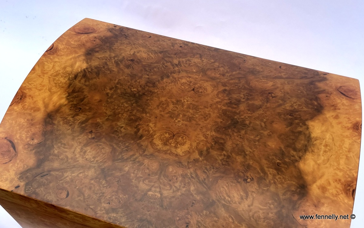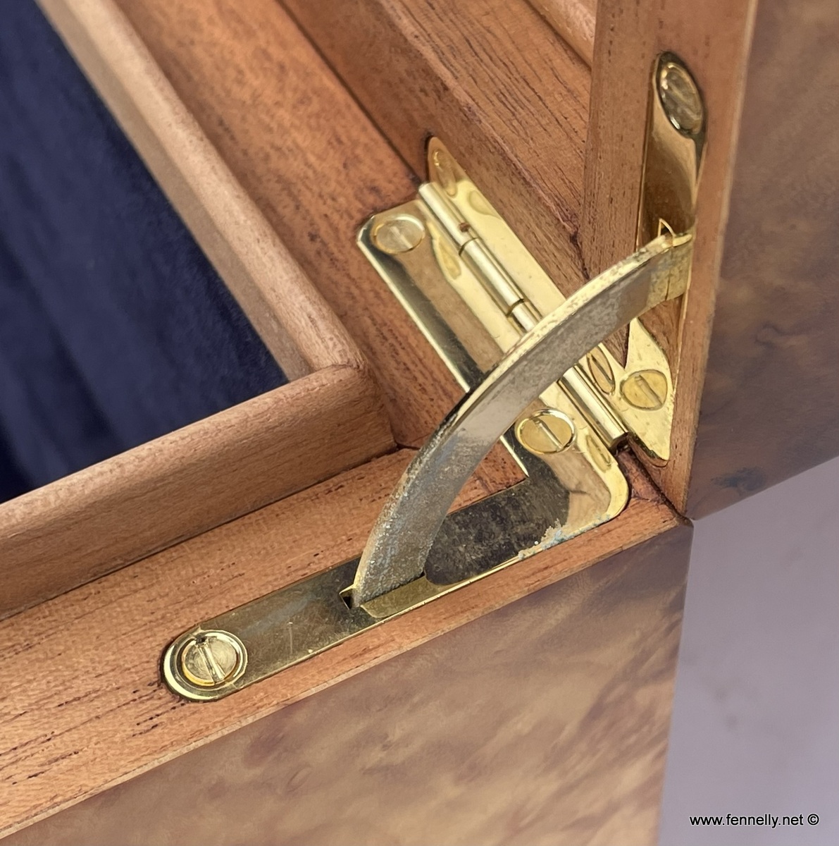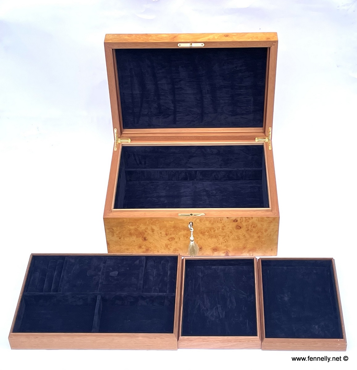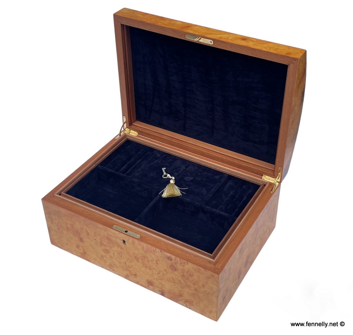 This Rare Myrtle Wood (Acasia in California – Know as Myrtle in Europe) Jewellery Casket was manufactured by the Famed Manning of Ireland Company and is truly a Jewel of Handcrafted Genius. This Box is constructed of the Finest Woods available and the Knowledge and Skill of 4 Generations of Box making in the Manning family is obvious. The Box is made of Mahogany , Spanish Cedar and Veneered in Myrtle Wood. The Hand rubbed Velvet finish and the luxurious fitted interior gives a richness that has earned the Manning Company a well deserved place at the Pinnacle of the Master Cabinet Maker.