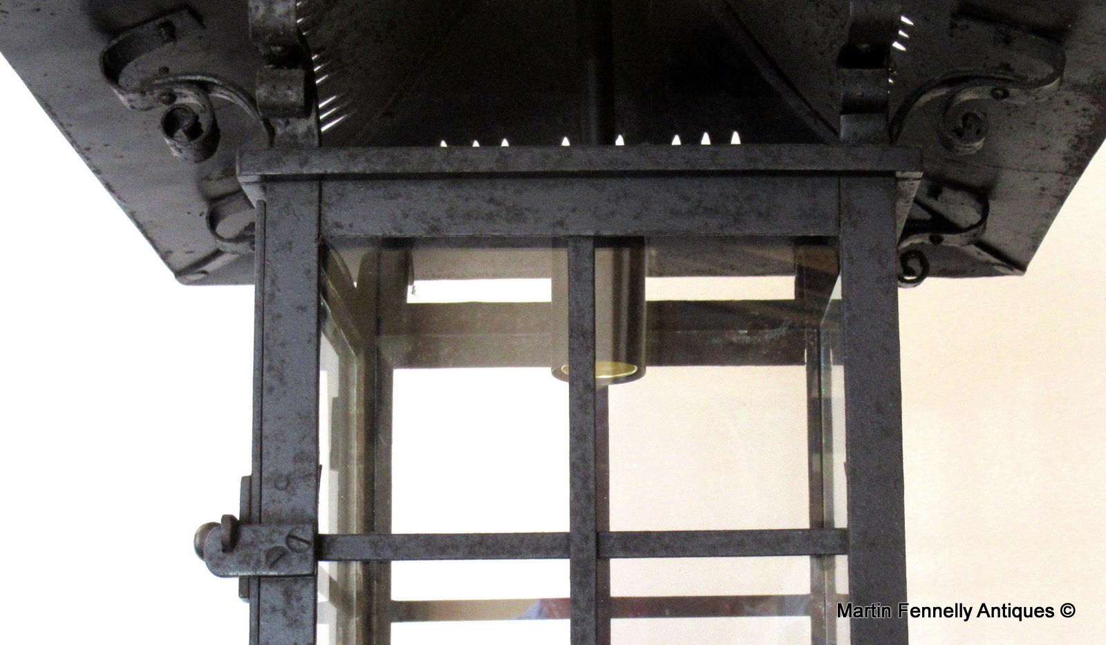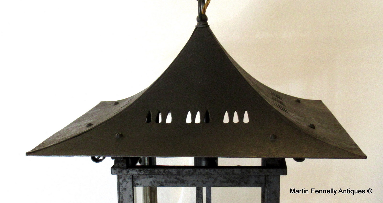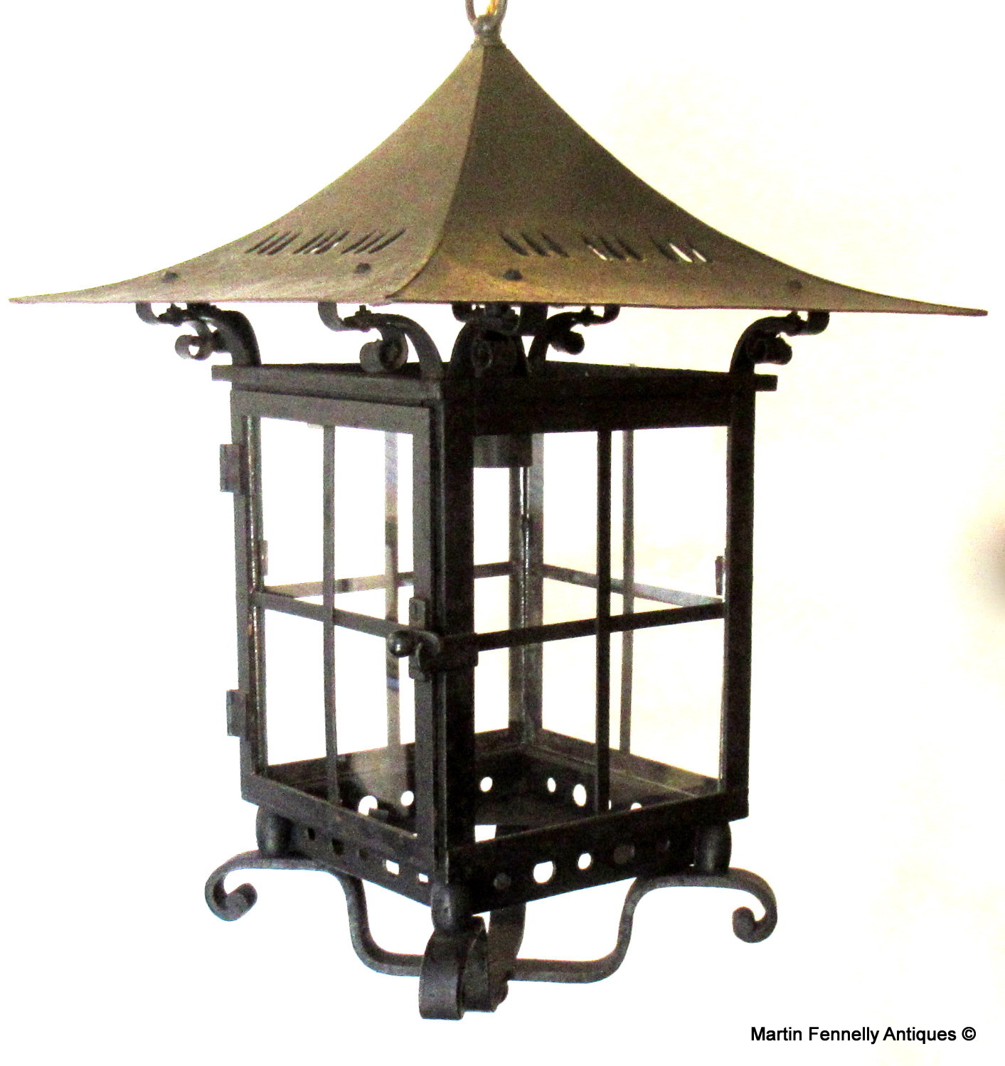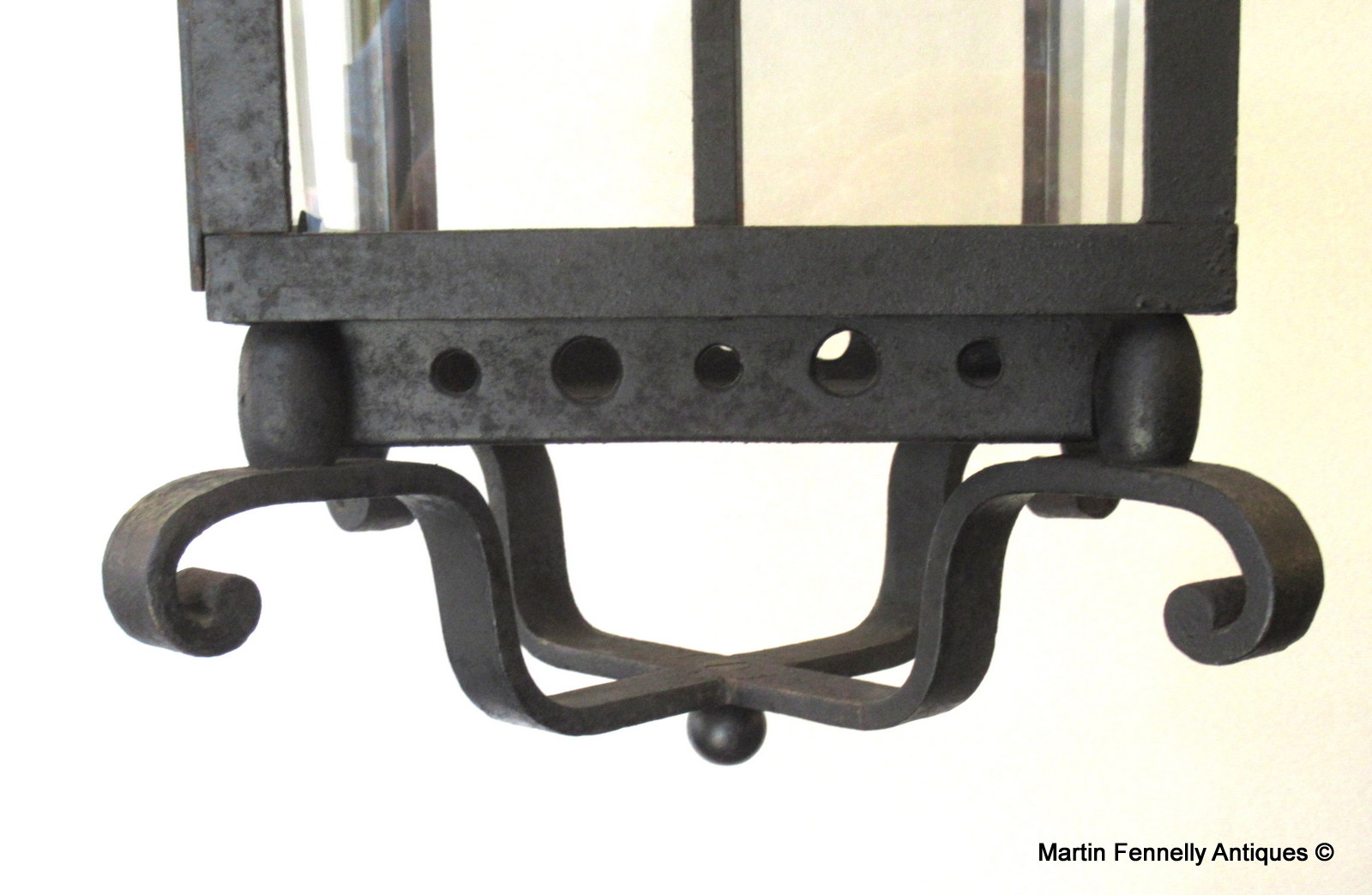 This English heavy Wrought Iron Lantern is really beautiful and dates to Circa 1880. The lantern is completely intact and all our specialist team had to do was rewire and clean the bronze structure. With the 140 year old patina and wonderful design, this lantern will add a touch a Victorian style to any hallway or outdoor area. The Lantern comes complete with matching chain and ceiling cup.