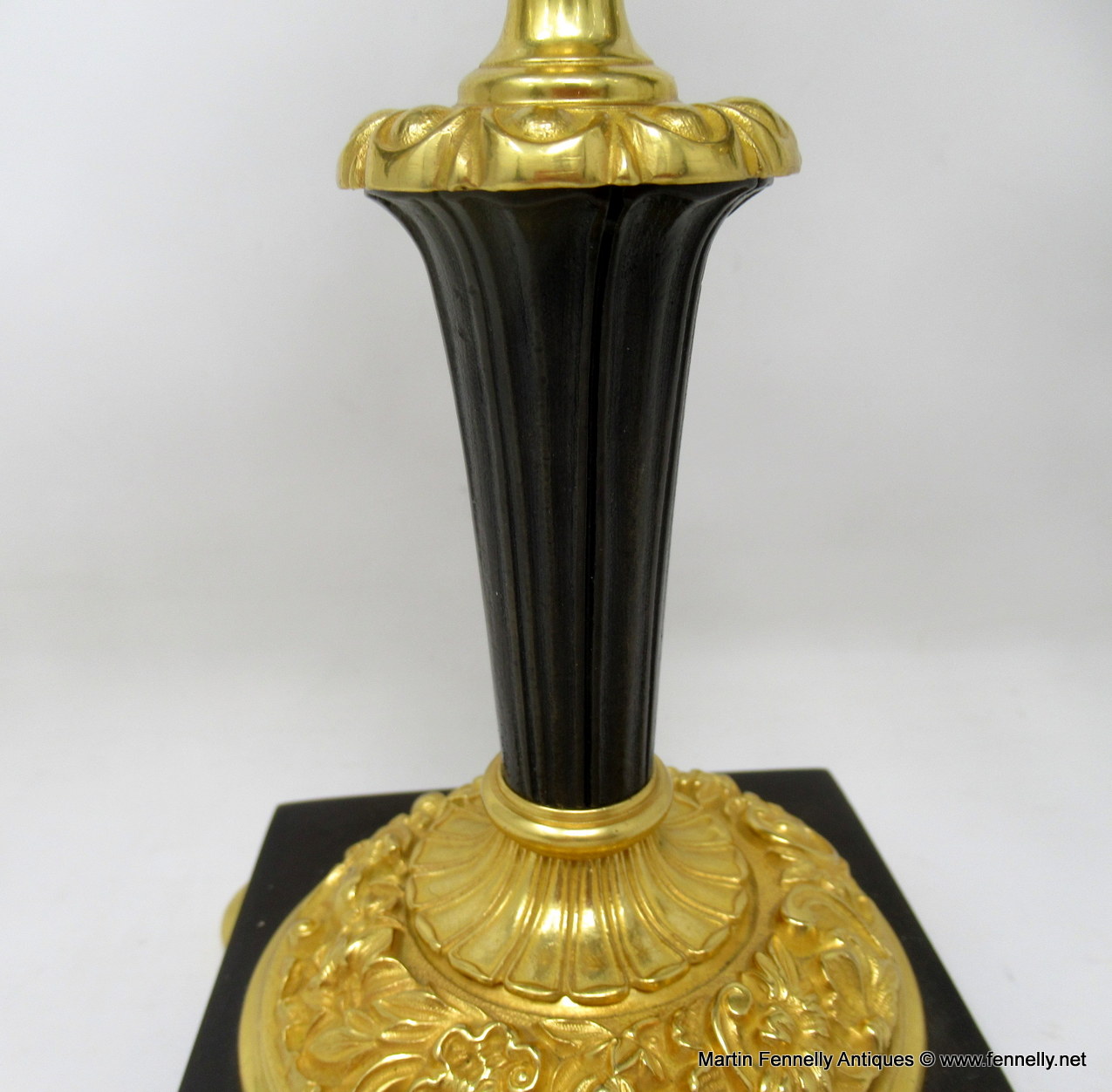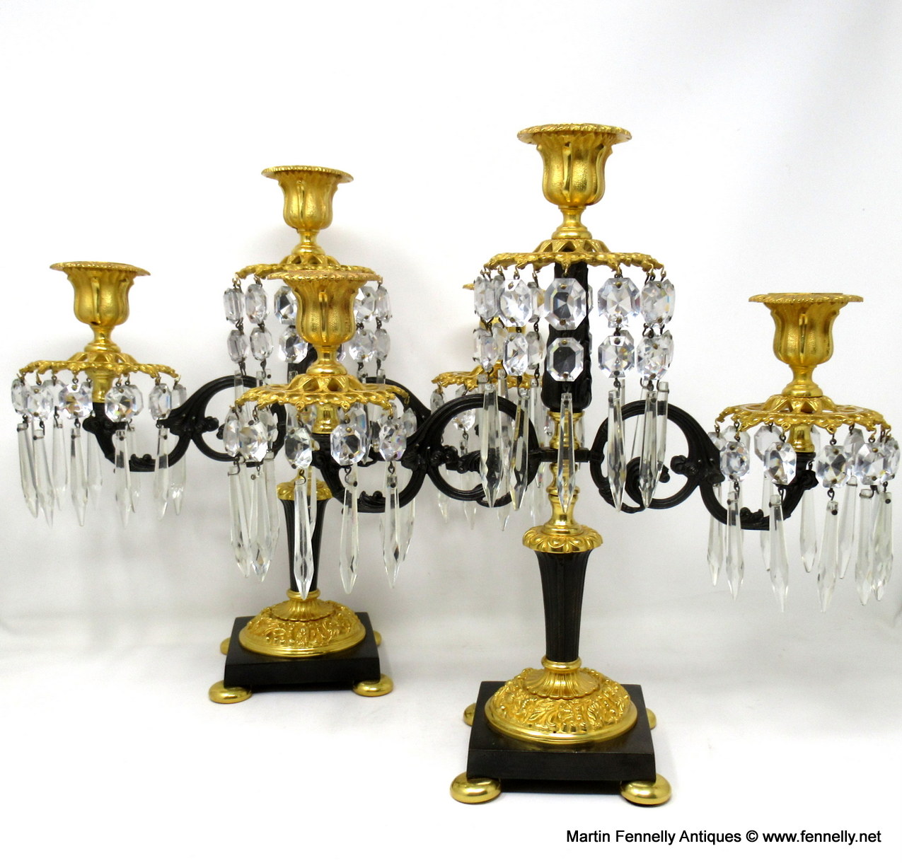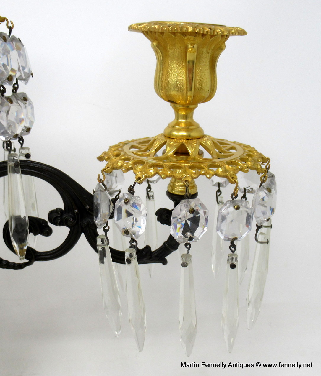 Each with a centered empire style bronze reeded support, issuing two decorative scrolled candelabras mounted with a canopy of eleven hand cut crystal spear shaped prisms. The main support in bronze and ormolu with similar detail, ending on a decorative circular ormolu and a plain square bronze platform on four bun feet.