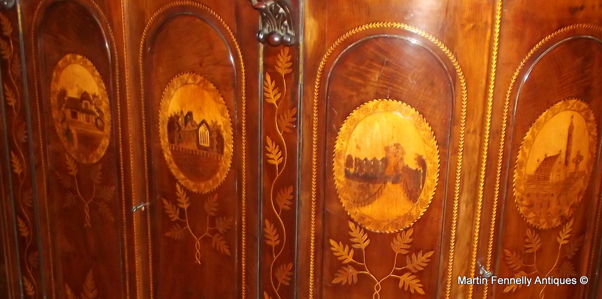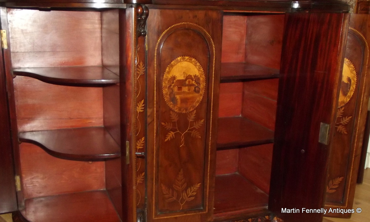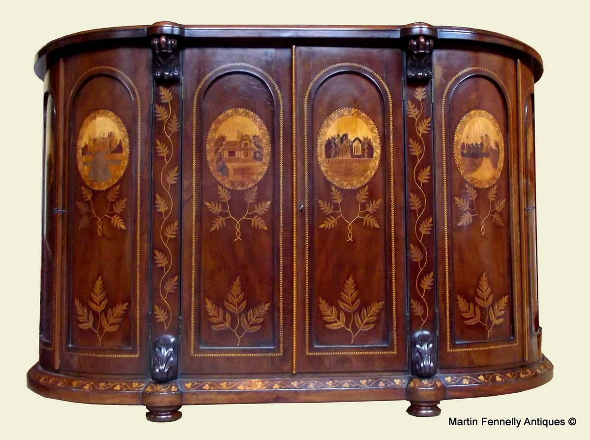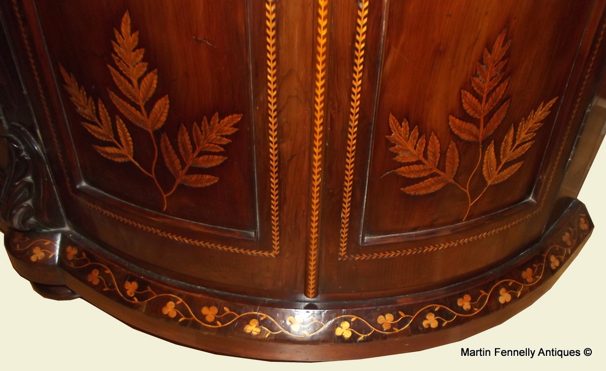 The find of The Decade ! – Museum Quality and possibly the only one in existence! . This Irish Credenza is truly spectacular and is in great condition. It is constructed from Arbutus and Yew Wood and has the full spectrum of Iish Imagery. The Credenza is in full original condition and was recently Cleaned and Waxed by our restoration experts. The 6 doors are all adorned with famous Images from the Muckrosse area in Killarney, Co Kerry. The Base has swags of Shamrocks running the entire length of the Credenza and each door is in laid with Irish Ferns.The doors all open perfectly and the curved ends are all superbly finished. The real delight with this piece and wonderful surprise was the finding of the Egan signature on top of one of the doors…….. It is so rare to find something this special and an item with a place in Ireland’s History. .