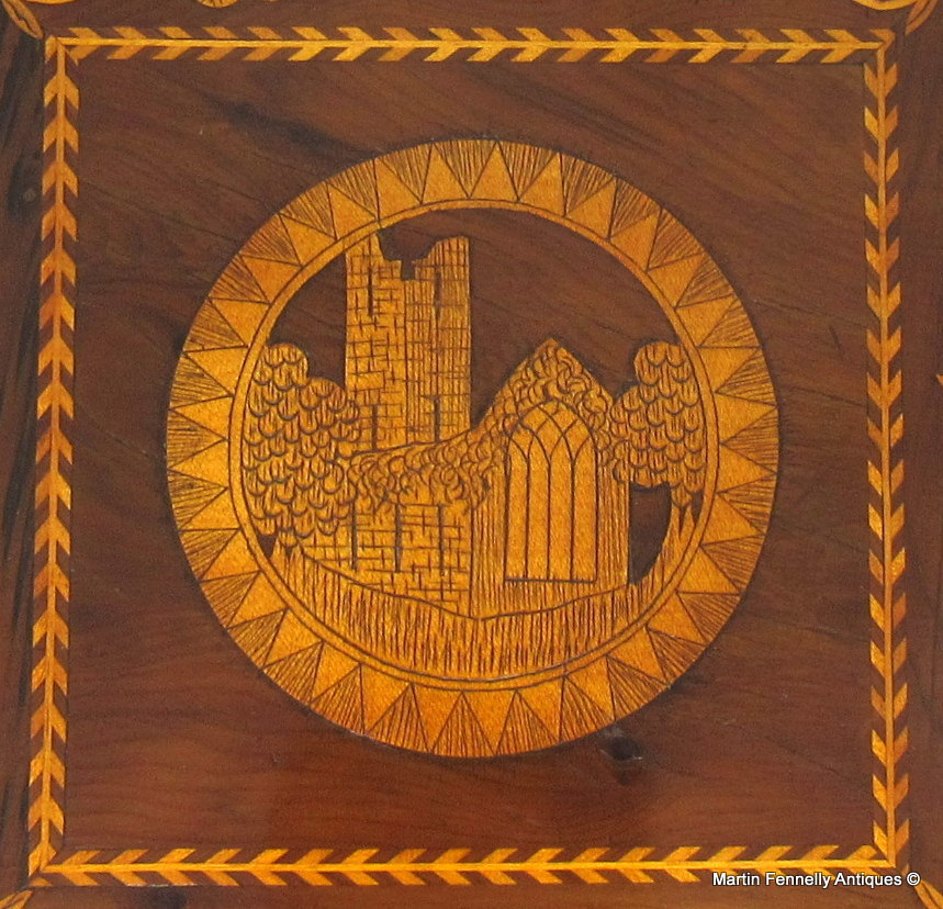 Mid to late Nineteenth Century. The square form thumb molded hinged cover with a central rectangular reserve with a view of Muckross Abbey surrounded with trailling Shamrock, inside is a view of an Irish Harp.Condition: This piece has been professionally restored, original firm hinges, lock and original key are present and working.