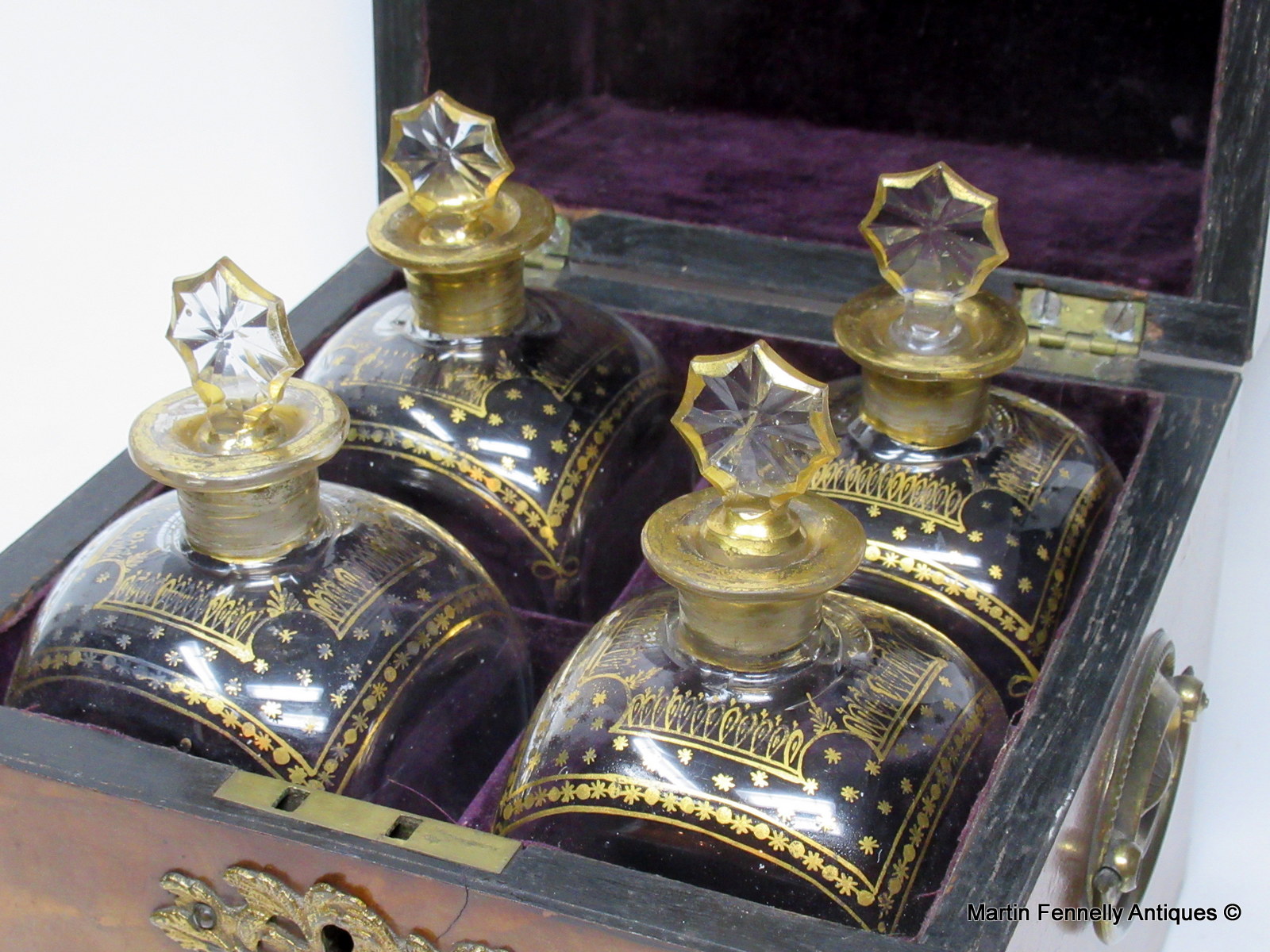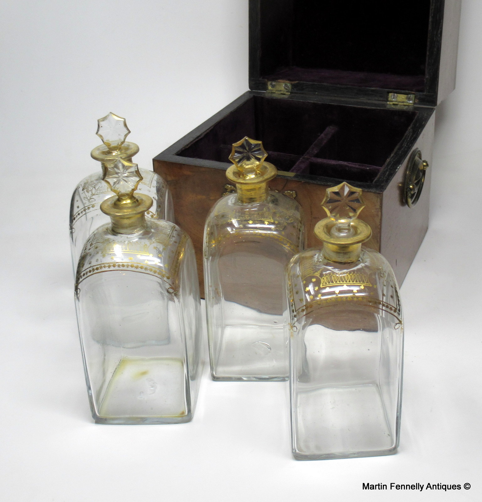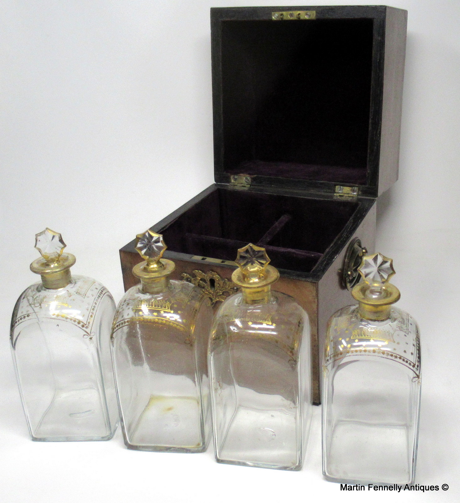 This is an early Mahogany Tantalus dating to Circa 1810 – English. It is in good condition. The Tantalus contain the original gilt painted 4 decanters with rare star stoppers. The condition of all decanters is good with no major chips which is surprising for a set which is over 200 years old. The Brass Mounts are also present ad i was delighted to locate this early piece in such good condition.