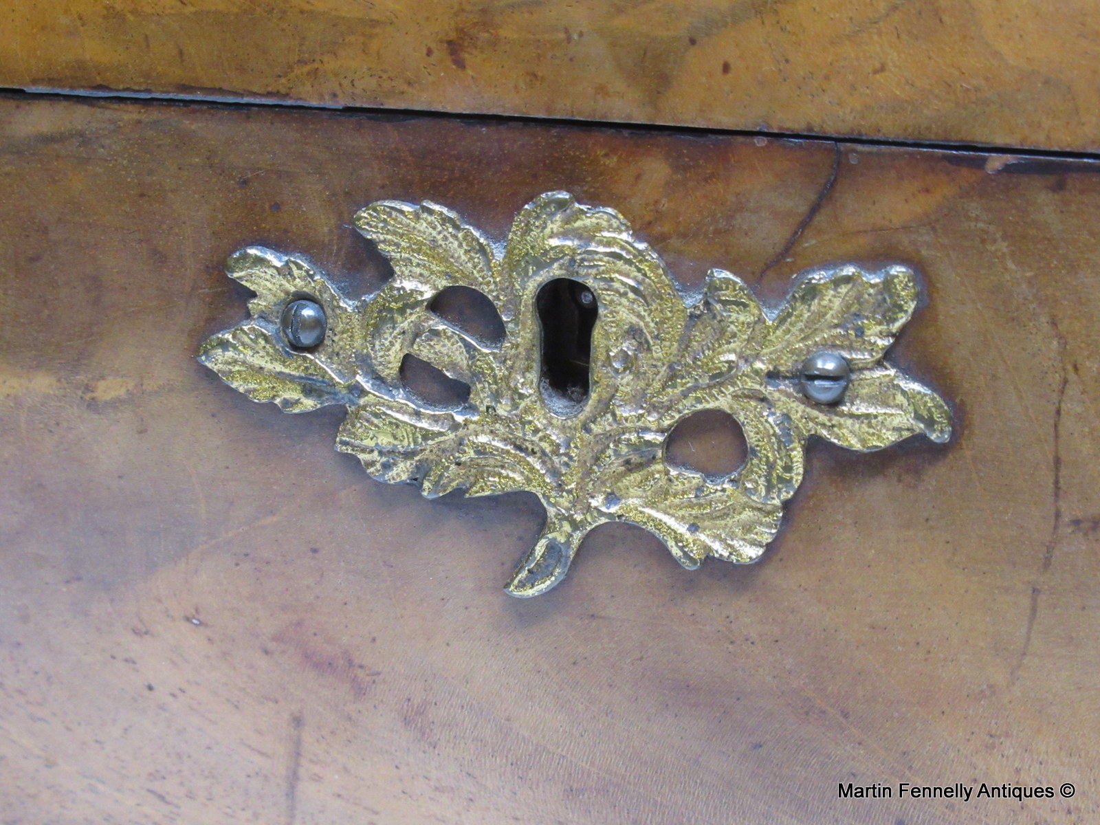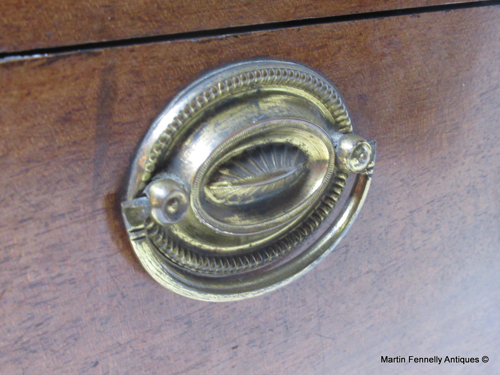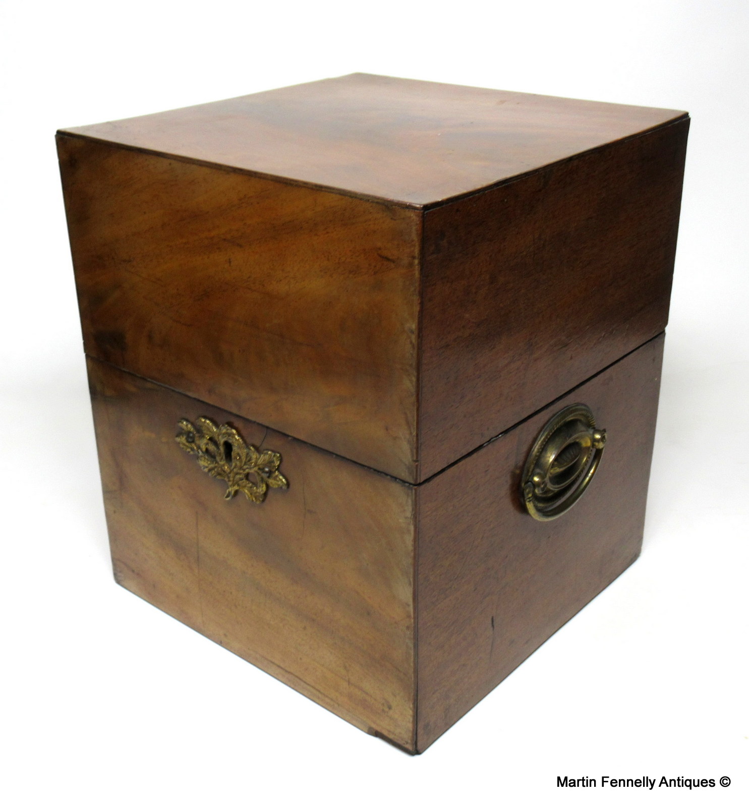 This is an early Mahogany Tantalus dating to Circa 1810 – English. It is in good condition. The Tantalus contain the original gilt painted 4 decanters with rare star stoppers. The condition of all decanters is good with no major chips which is surprising for a set which is over 200 years old. The Brass Mounts are also present ad i was delighted to locate this early piece in such good condition.
