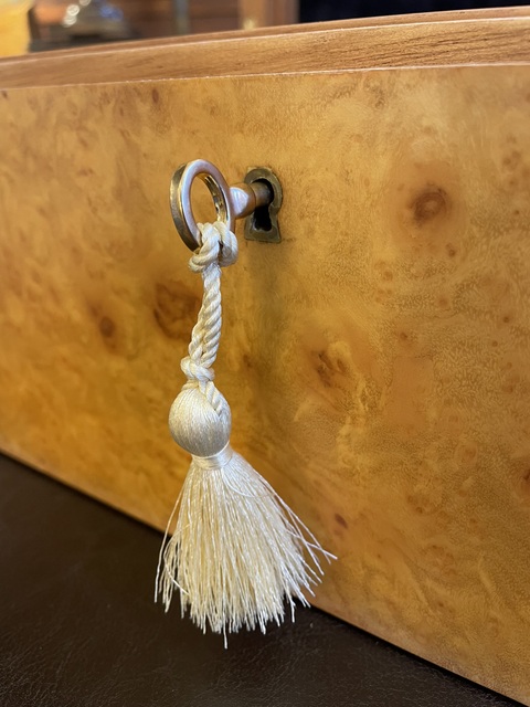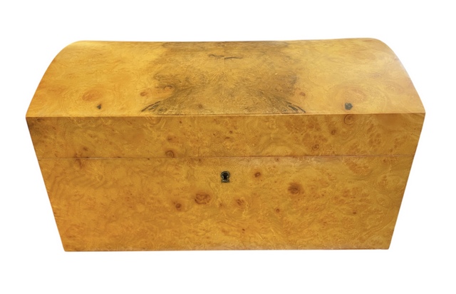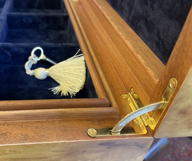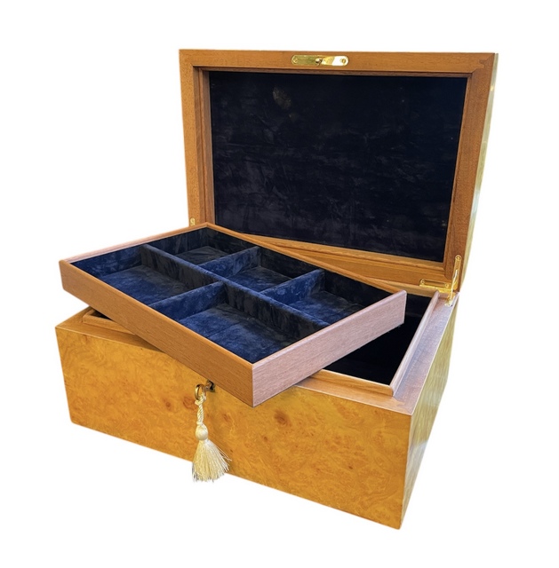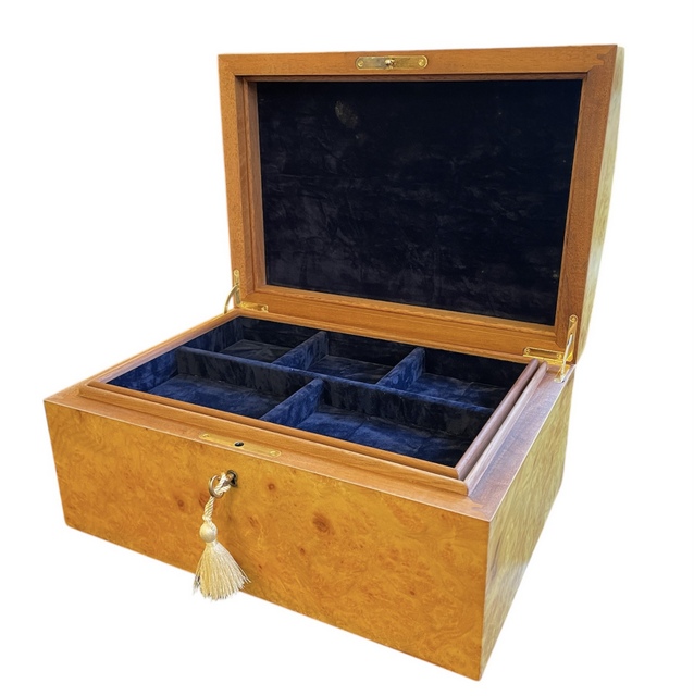 Stunning Rare Large Myrtle Wood Jewellery Casket – Manning of Ireland – This Rare Myrtle Wood (Acasia in California – Know as Myrtle in Europe) Jewellery Casket was manufactured by the Famed Manning of Ireland Company and is truly a Jewel of Handcrafted Genius. This Box is constructed of the Finest Woods available and the Knowledge and Skill of 4 Generations of Box making in the Manning family is obvious. The Box is made of Mahogany , Spanish Cedar and Veneered in Myrtle Wood. The Hand rubbed Velvet finish and the luxurious fitted interior gives a richness that has earned the Manning Company a well deserved place at the Pinnacle of the Master Cabinet Maker.