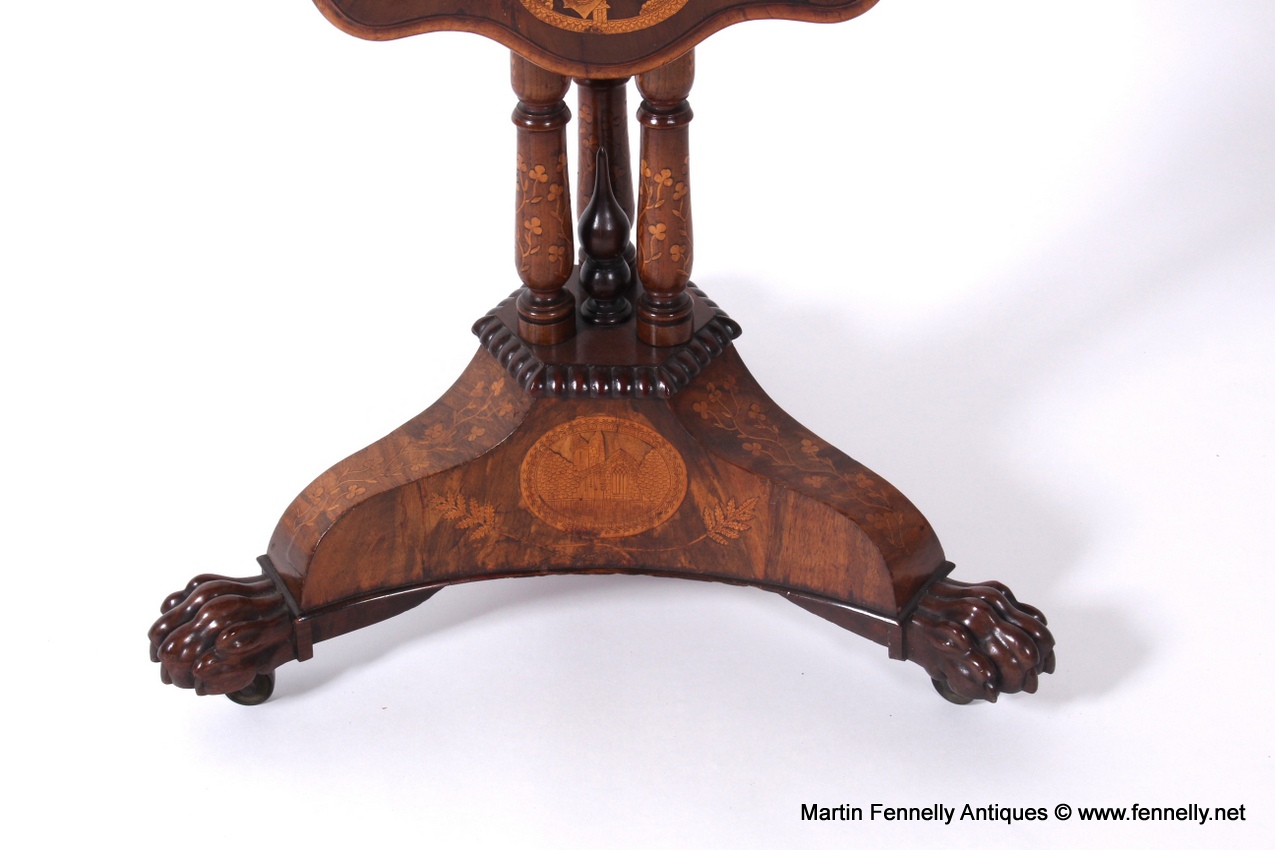 Killarneyware – Killarneyware Table Circa 1870 – Museum Quality This piece of Irish History is truly Stunning and in some expert opinions, the best piece of Killarney Furniture currently for Sale. It was made in Co Kerry Ireland in the late 19th Century. It is constructed from Arbutus and Yew Wood and has the full spectrum of Iish Imagery … Shamrocks – Ferns – Harps and much more. The Table is in full original condition and was recently Cleaned and Waxed by our restoration experts. When it comes to a beautiful piece of Irish Furniture and also an investment item these pieces of Killarney are perfect, especially when they are as detailed as this one. There are 10 Scenes on this piece and this puts this Table way above some plainer pieces that you may find.
