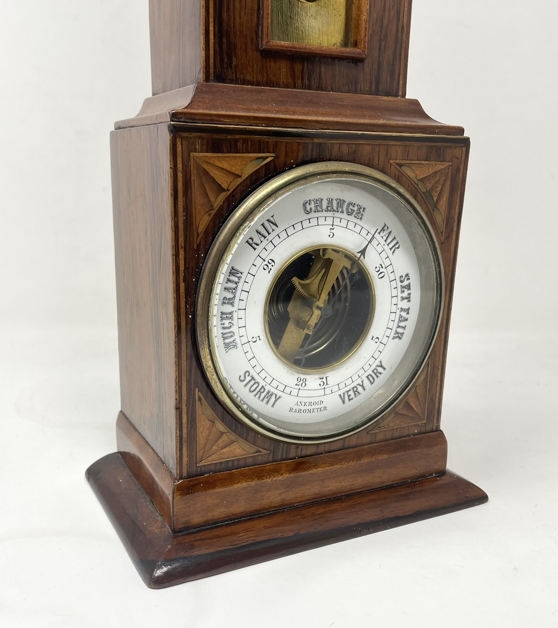 Exceptionally Fine English Well Figured Rosewood with attractive Sheraton Style Boxwood Inlay Miniature Grandfather Combination Time Piece, Clock, Thermometer and Barometer of outstanding quality.