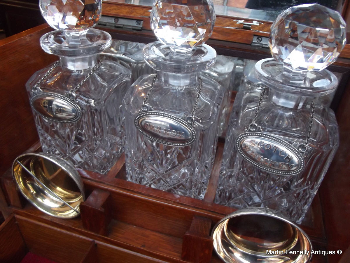 This is a superb late Victorian Oak and Brass Tantalus with Silver Decanter Tags from CT Burrows and Sons of Birmingham with Assay marks to 1898. This Tantalus is in great Condition and truly makes quite the statement as it sits proud complete with 3 Hand Cut Crystal decanters with multi-faceted stoppers. The Box also contains two Silver plated tasting dishes and Silver plated Serving Tray. It has the original working lock and key and is complete with Storage Drawer at the front and secret storage area which is revealed when the Tantalus is opened. Please note the origin and meaning of the word Tantalus Just click on the link. This is a Spectacular item and Rare in this condition.