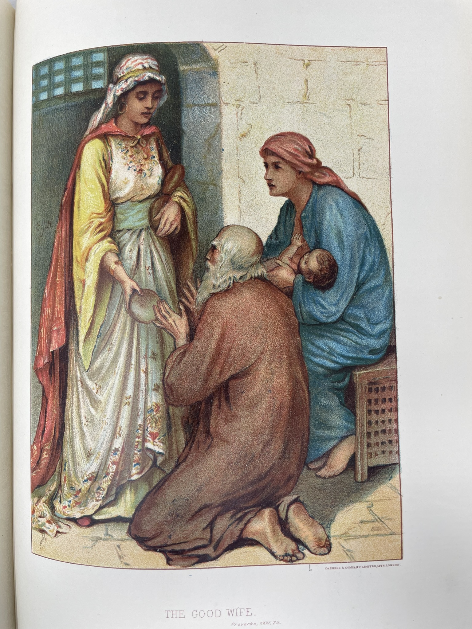 This brightly illustrated National Family Bible by Cassells and Company is in a full morocco binding, containing both the Old and New Testament, and with metal clasps in full working order .There are over 1200 pages and multiple Colour Plates. There are multiple black and white plates which are after the illustrations of famed French printmaker and artist Gustave Dore. This striking work was edited by Scottish theologian, Presbyterian minister and Biblical critic John Eadie, who was the Professor of Biblical Literature for the United Presbyterian Church. Present within this volume are the ‘commentaries of Scott and Henry’, and ‘many thousand critical and explanatory notes’.This edition dates to circa 1880. In the original full morocco binding, with gilt detailing and full working metal clasps. Light rubbing to raised bands, spine head and tail, and joints. Internally, firmly bound. Pages very clean and bright. Plates exceptionally bright, and retaining their original tissue guards. This Bible incredibly has no owners names and in my opinion was very little used. This is a real find and after 140 years will hopefully find a family to fill in the pages where the owers names and picture can be placed.