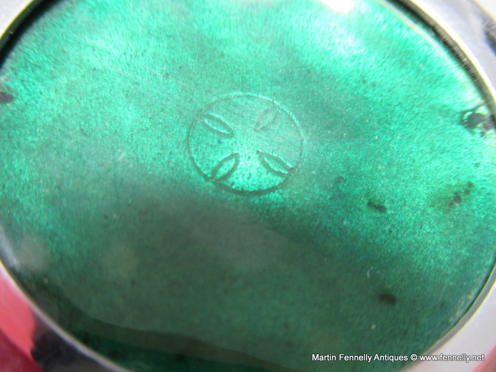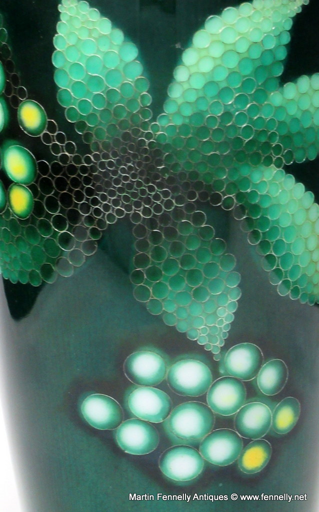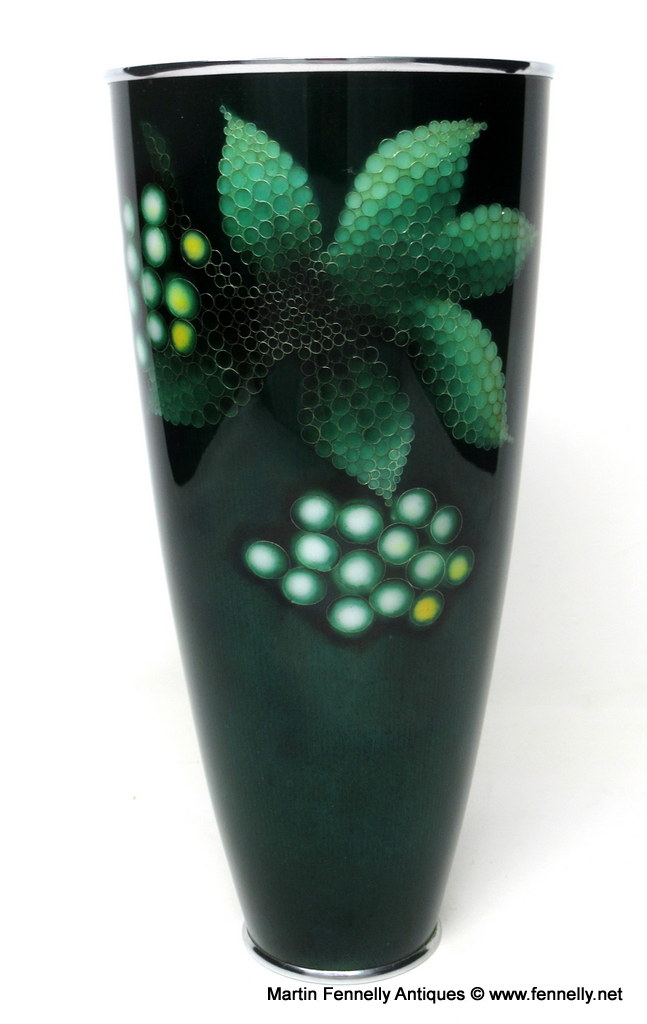 Stunning Shōwa period Japanese Beaker Vase Circa 1950 – Ando – Nagoya. This rare vase has a copper body with an applied silver rim and silver base plate. The rich dark green glazed ground is decorated with large-headed Vine and Grape detail in shaded silver yusen, shosen and musen enamels. The faint colours of the foliage and grape and the vanishing stems have an almost ethereal quality. The decoration is distinctly modern in feel and does not follow or imitate any recognisably traditional Japanese style. The same enamel has been applied to the base, which has the mark of the Ando Company in silver yusen enamels. This type of rare vase is very difficult to make and confirmation of this is evidenced by the following Literature: See Gregory Irvine, Japanese Cloisonne, V&A, 2006, page 97 for a similar example in the Victoria and Albert Collection