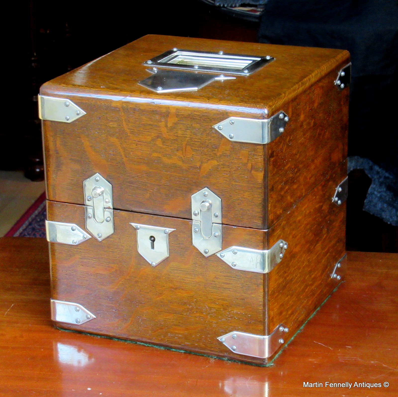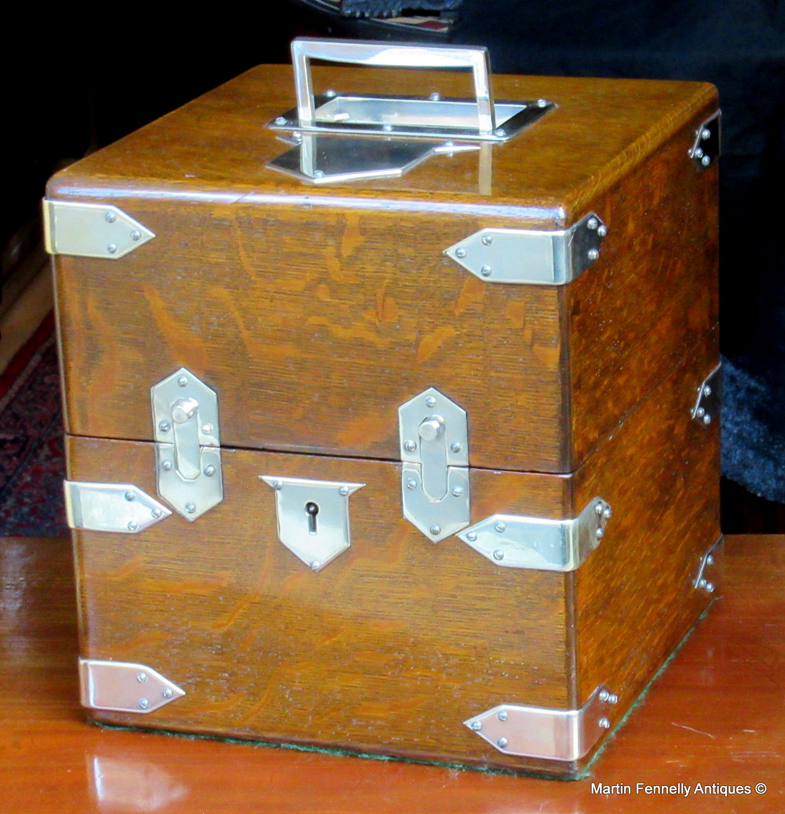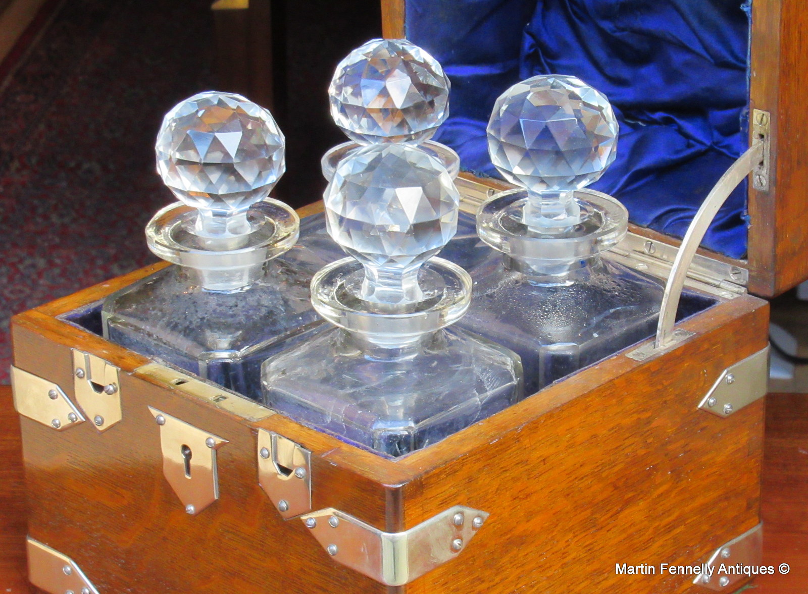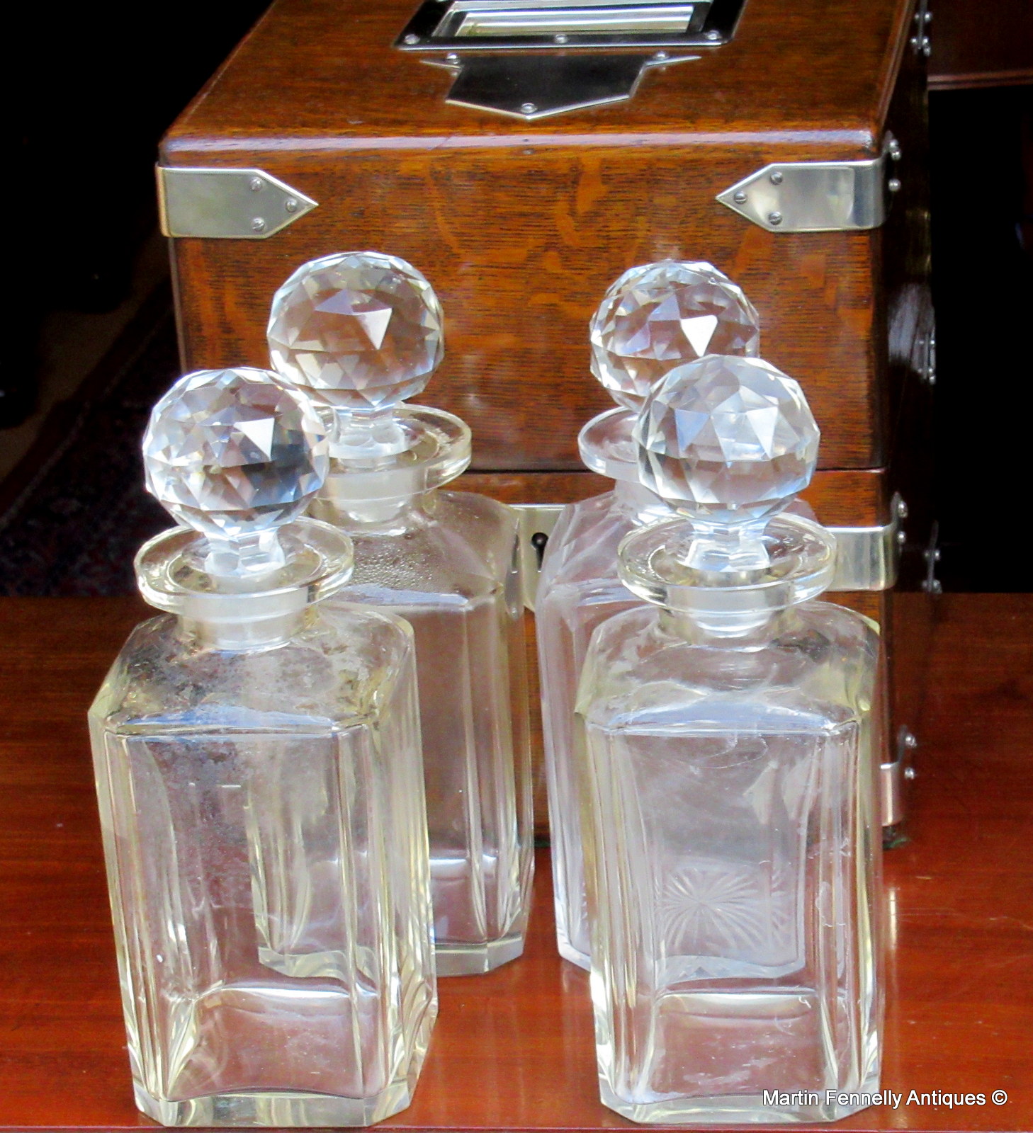 This is an Edwardian Oak Tantalus dating to Circa 1910 – English – Silver Plated Mounts. It is in good condition. The Tantalus contains 4 decanters with original stoppers. The condition of all decanters is good with no major chips which is surprising for a set which is over 100 years old. The Silver Plated Mounts are also present and i was delighted to locate this early piece in such good condition.