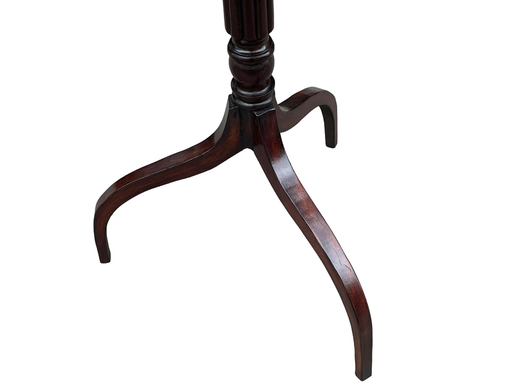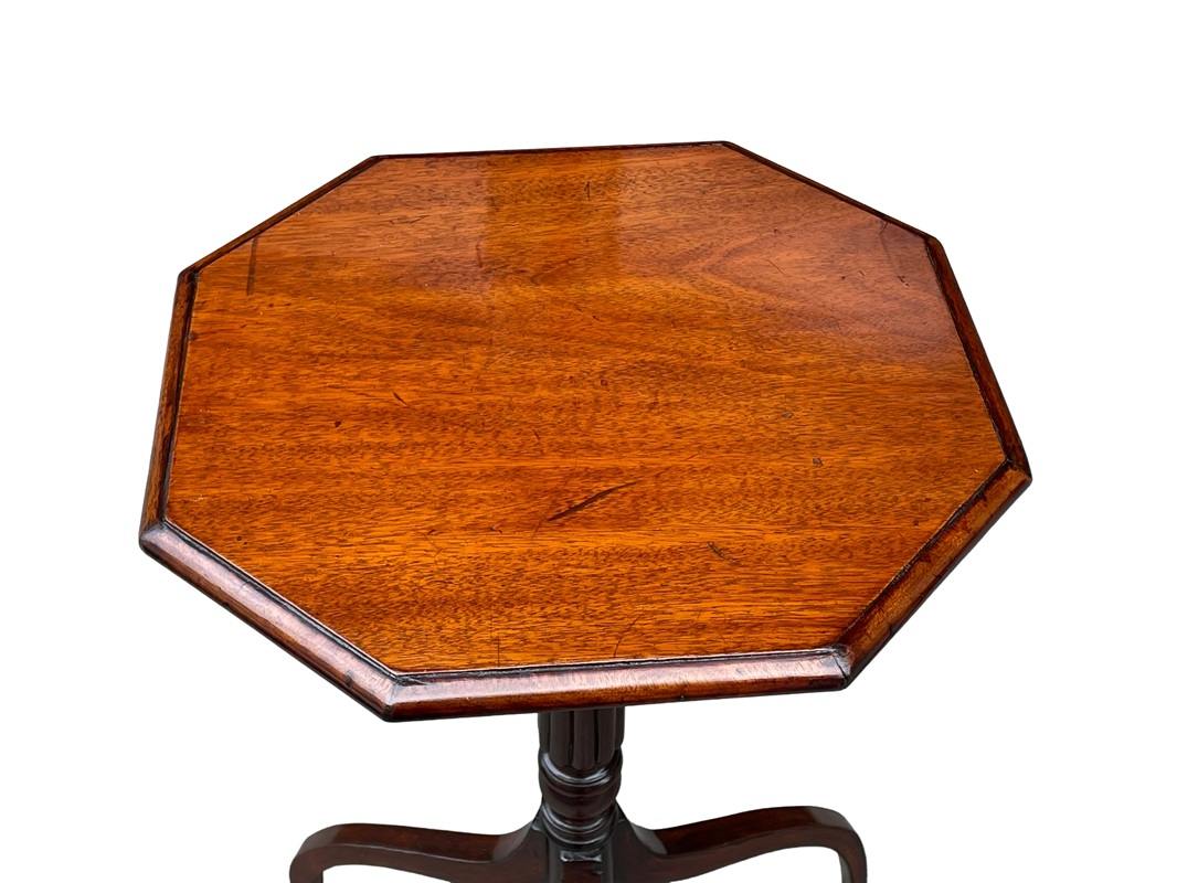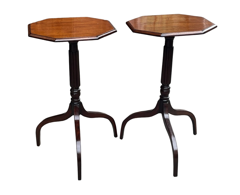 These are a lovely Pair of early Victorian Wine Tables dating to Circa 1860. They are English and constructed from Mahogany which has a deep rich colour. The well figured octagonal top is raised on a reeded column and tripod legs. These are very elegant and lovely to have a pair.