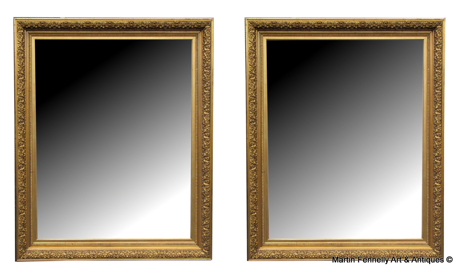 Pair of French Gilt Mirrors Circa 1890 This matching Pair of French Gilt Mirrors date from 1890 and are in Good condition. The Pair would look stunning displayed either side of a fireplace or in a pair of alcoves. They are of a very useful size and would sit very well in a room with a low ceiling. The Frames have intricate detail applied to all sides and can be displayed as landscape or portrait which makes them very versatile – Lovely Mirrors these and rare to find a relatively small matching pair. The original stamps are on the back from Boulevard de Sebastopol in Paris.