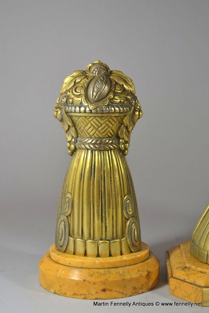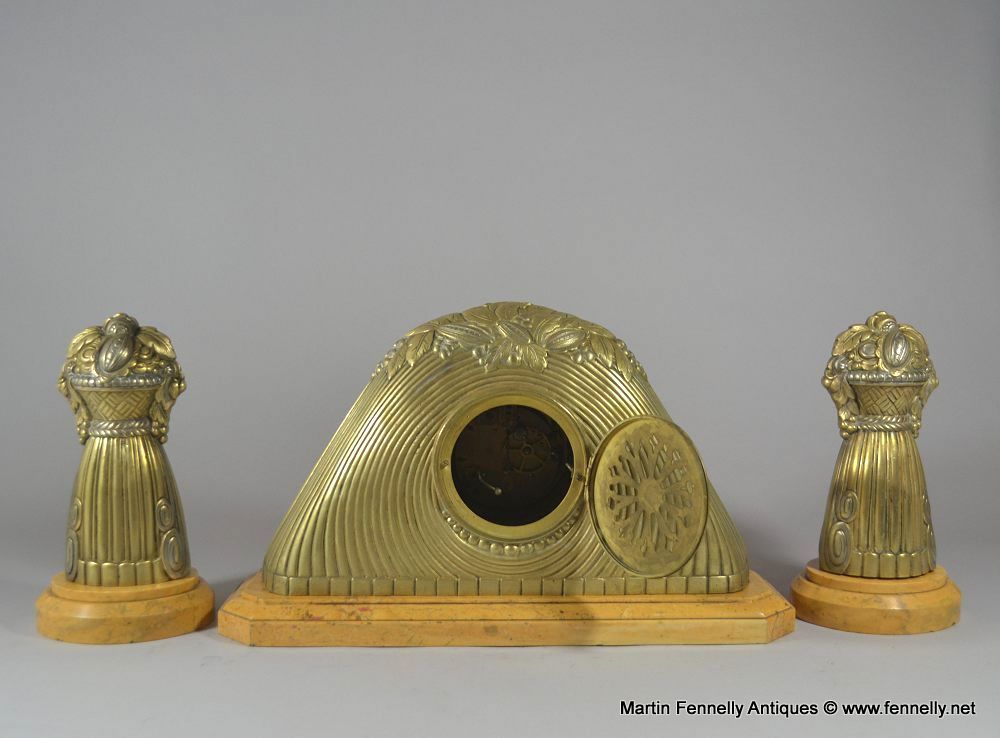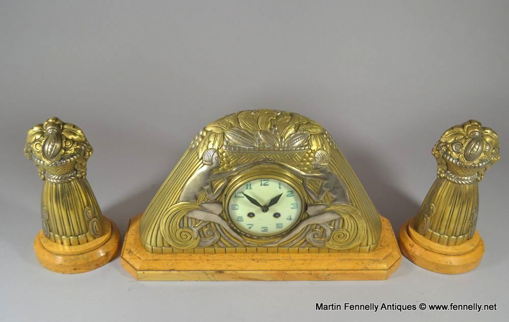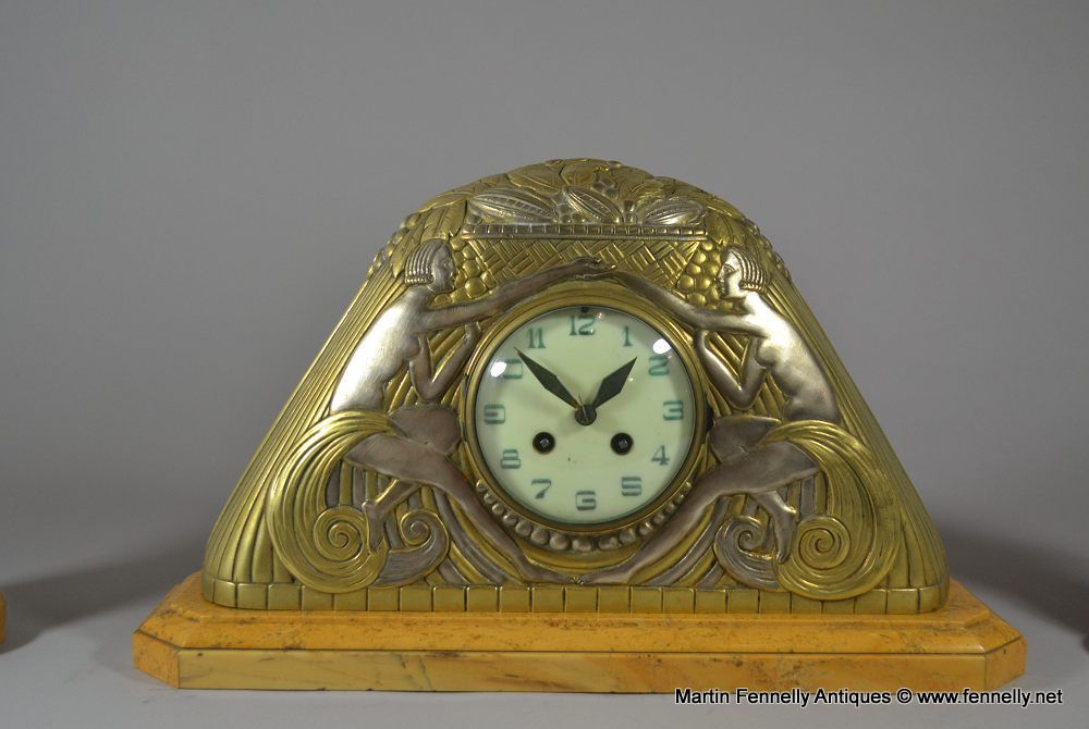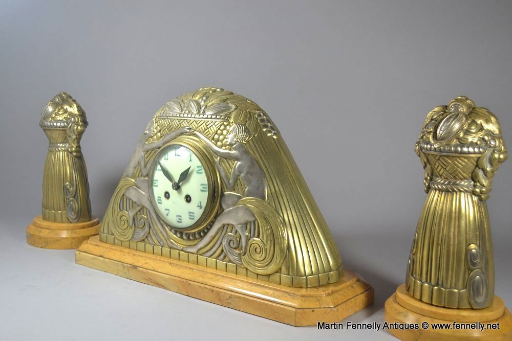 This Large Art Deco Clock and Garniture date to Circa 1920 and were made in Paris. Displaying the complete array of Art Deco Design and in wonderful condition. The Clock is complimented by matching Garniture and the set makes for a very striking view. The Clock is wonderfully detailed with Deco Design Ladies, Motifs, Scarves and fine period detail to the sides and base. The Garniture are also finely detailed and the complete set which is of a large size would make an impressive Art Deco interior design statement in any home. The Clock is stamped from Paris and is working with original pendulem, Bell and Key. This is a real nice original Art Deco set.
