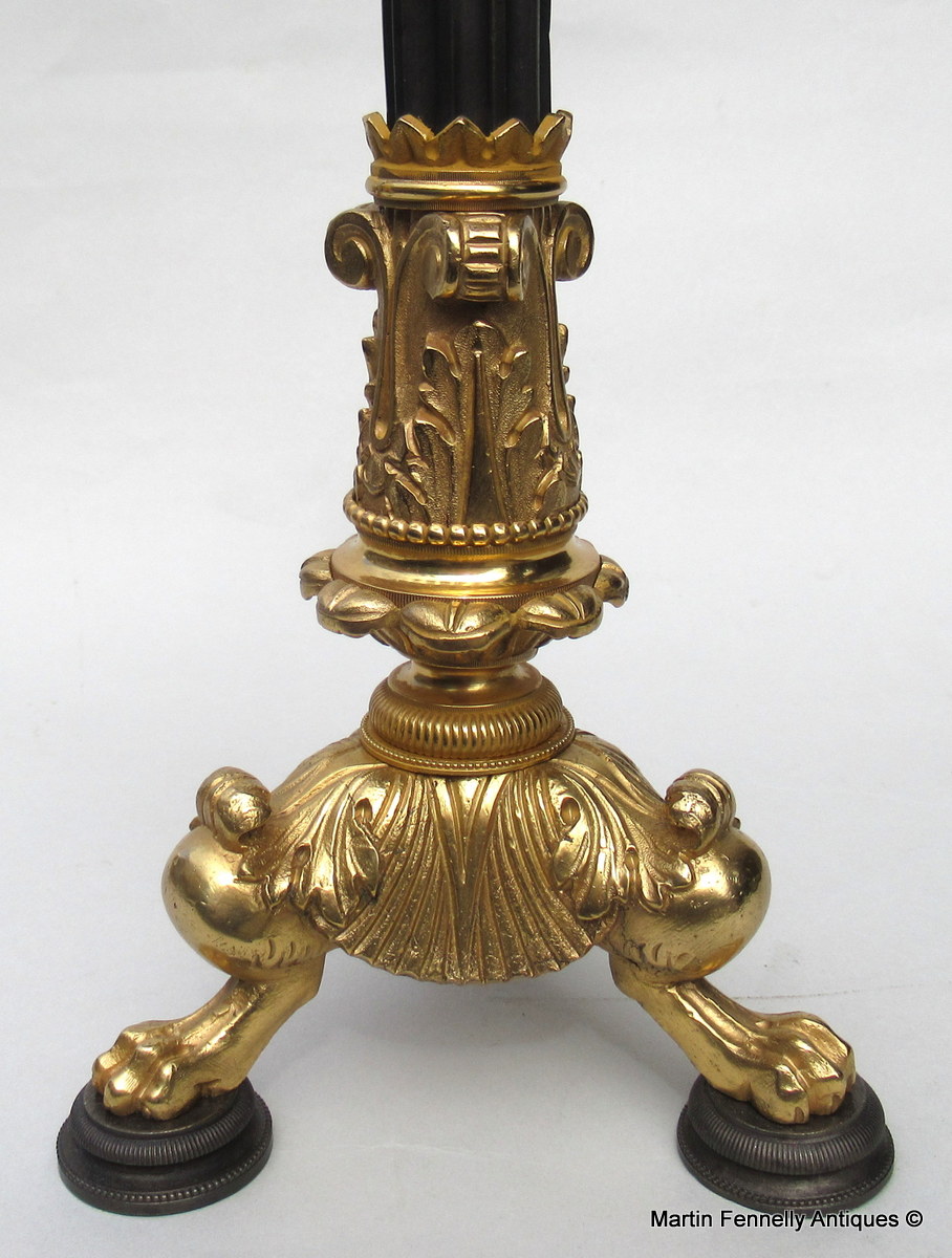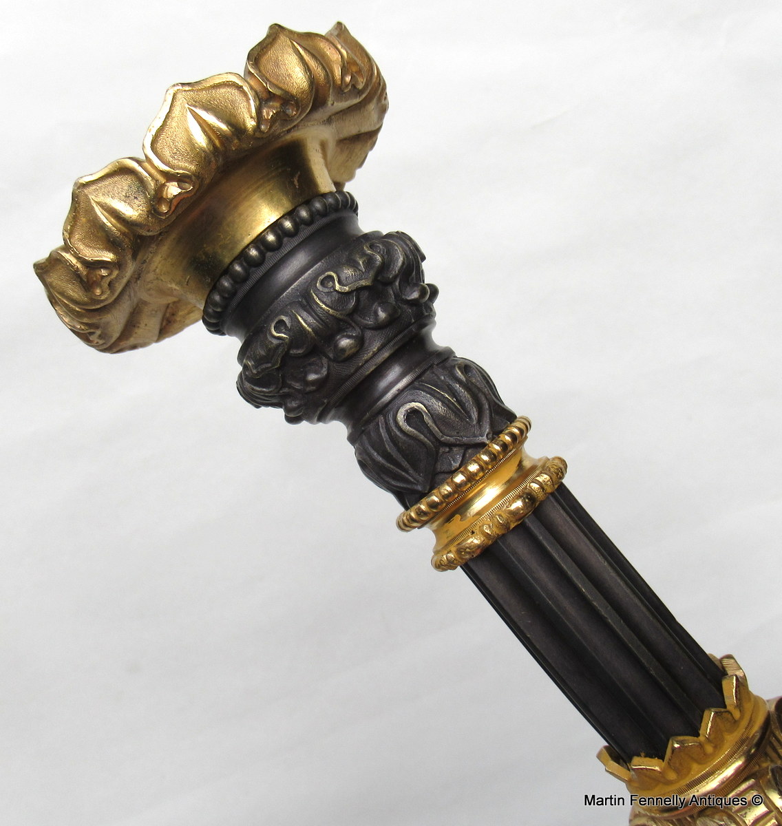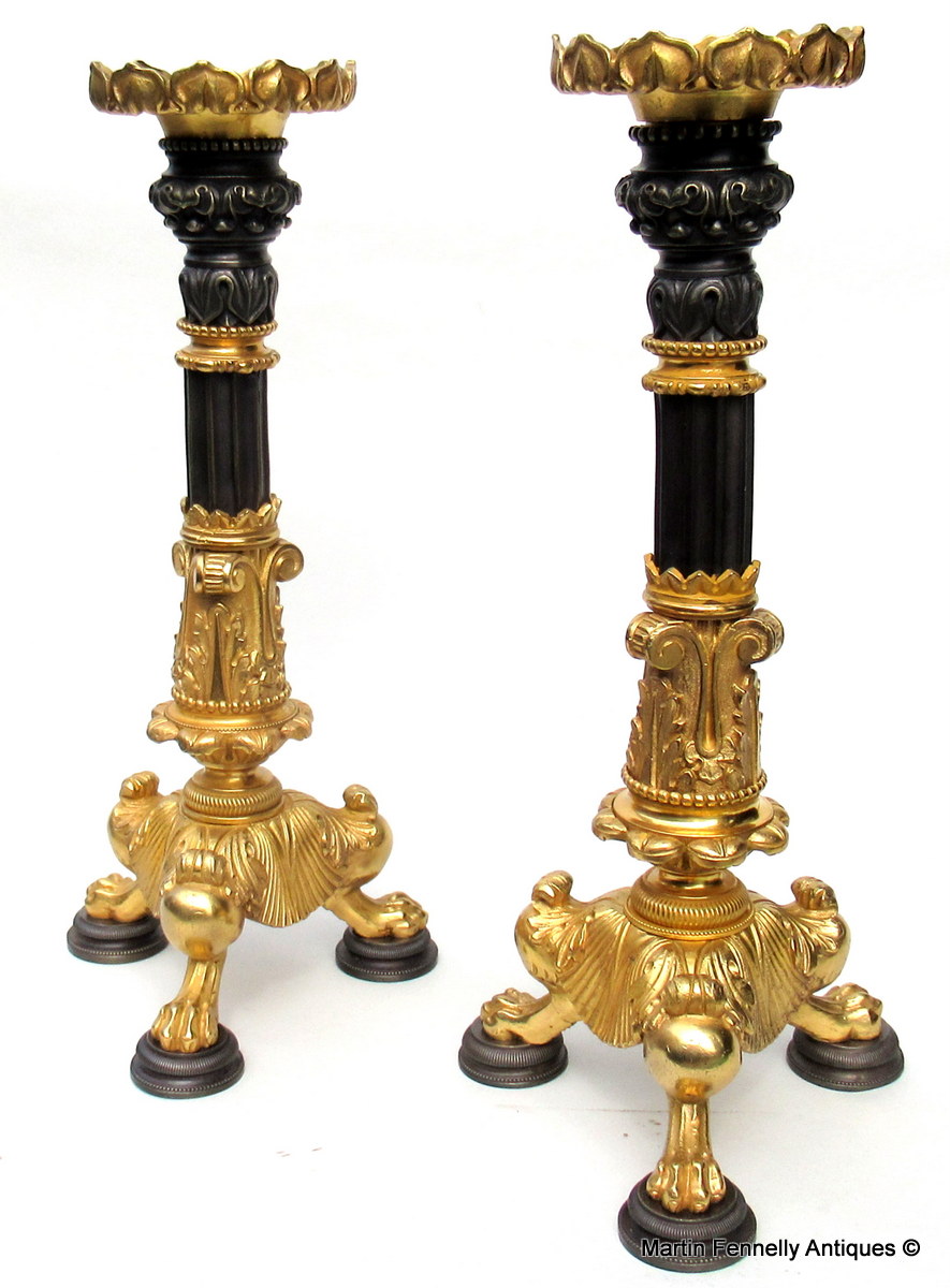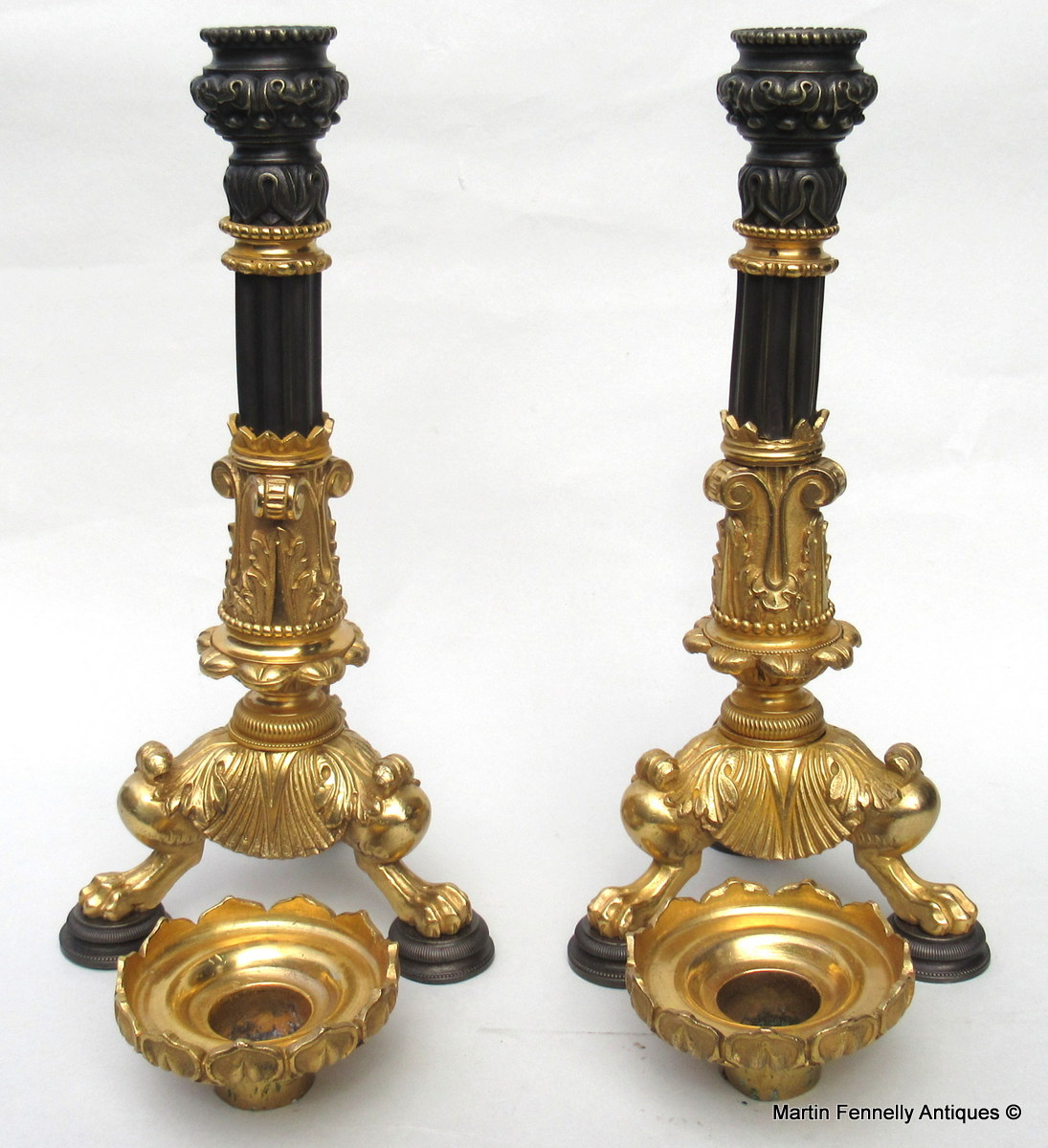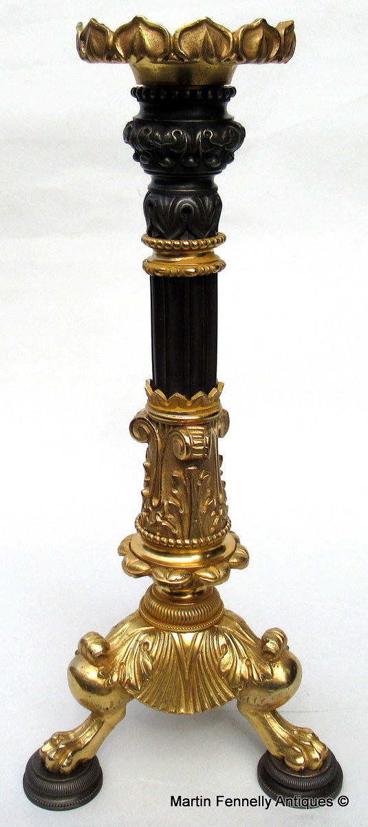Fine Pair French Ormolu and Bronze Single Light Candlesticks of medium proportions, each with unusually cast tapering fluted central bronze reeded columns, ending with three monopodia supports with circular pad feet, complete with original firm fitting drip pans. First quarter of the Nineteenth Century, Regency period. Condition: Superb condition, these Candlesticks have been professionally re-gold plated and bronze patinated, original firm fitting drip pans.