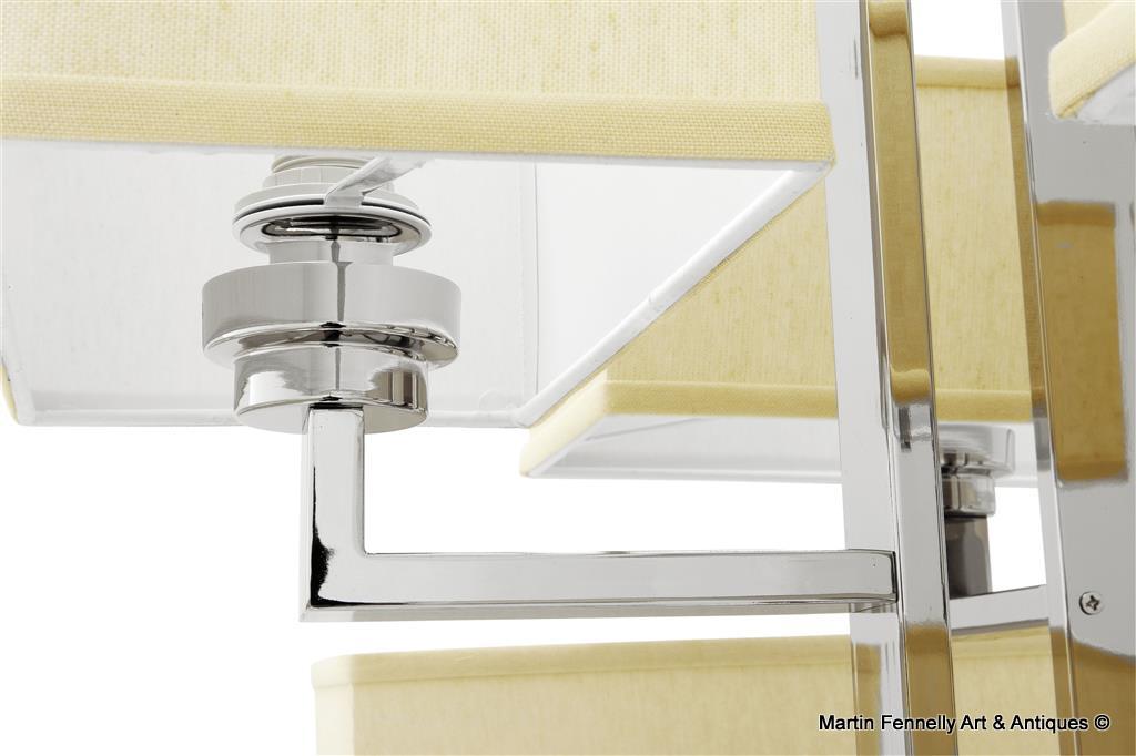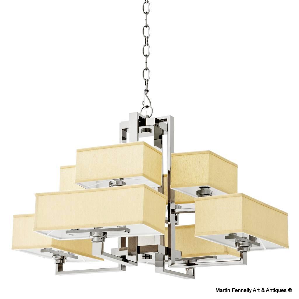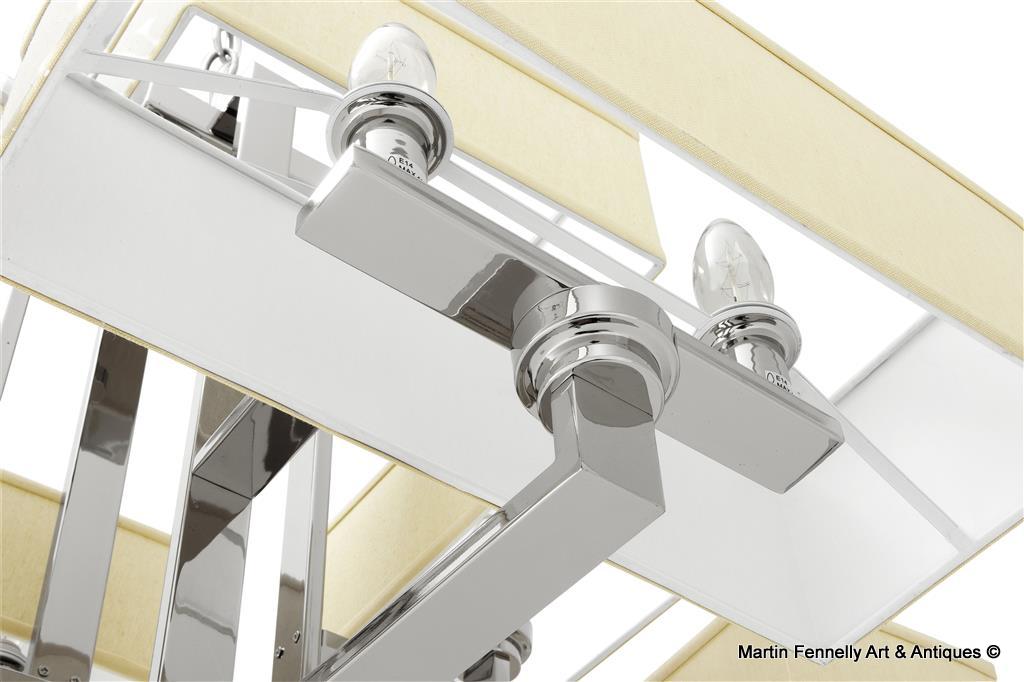 Polished Steel 12 Light Chandelier. This Chandelier features an abundance of sleek edges. Simplistic and contempoary, this unusual design will bring light and balance to a room. The neutral tones of the cream coloured lamp shades makes this chandelier flexible to fit in with a vast array of colour schemes, and the modern polished stainless steel frame adds a touch of deco or art nouveau elegance. The Chandelier comes with 12 Lights, Polished Steel Chain,Shades and Wired.