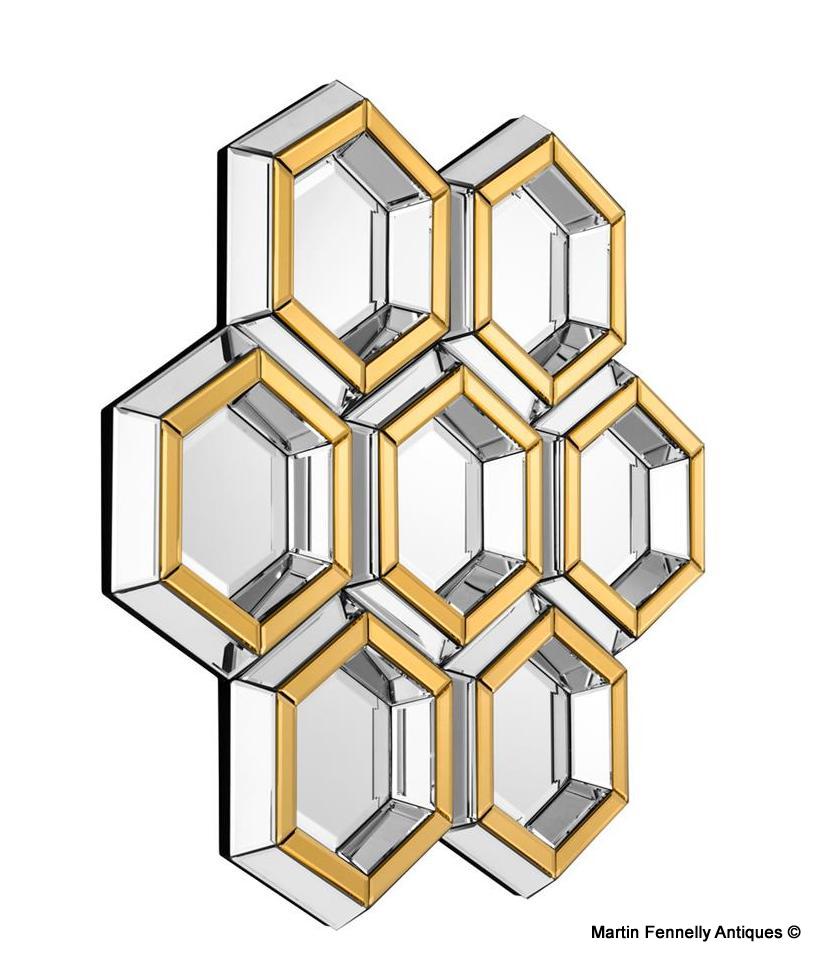 Stunning Art Deco inspired Hexagonal bevelled Multi Mirrored – Mirror with gold detailing. This Mirror truly creates a mesmerising style statement. The sculptural design exudes restrained glamour and will be the talking point at that party evening with friends at your home. The configuration forms a honeycomb cluster of convex mirrors. Adorned with bevelled mirrored glass edges and gold finish inner frames, The Mirror can be fixed either Portrait or Landscape and certainly makes a a stunning show in the appropirate space at you home.