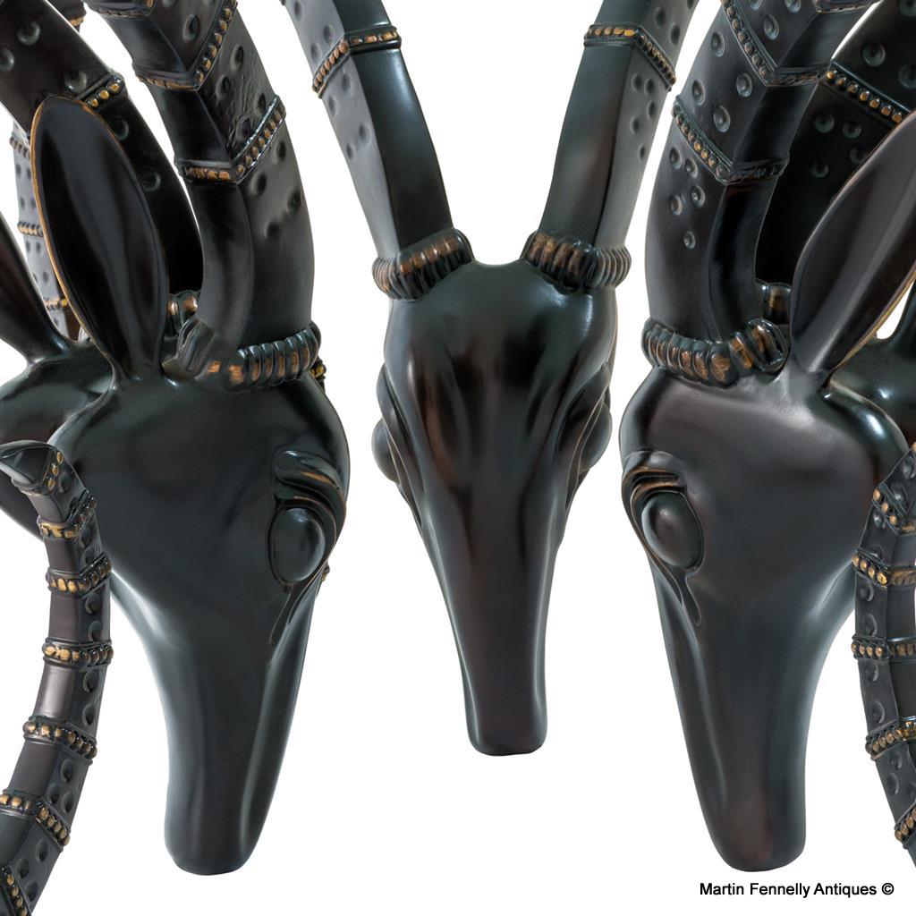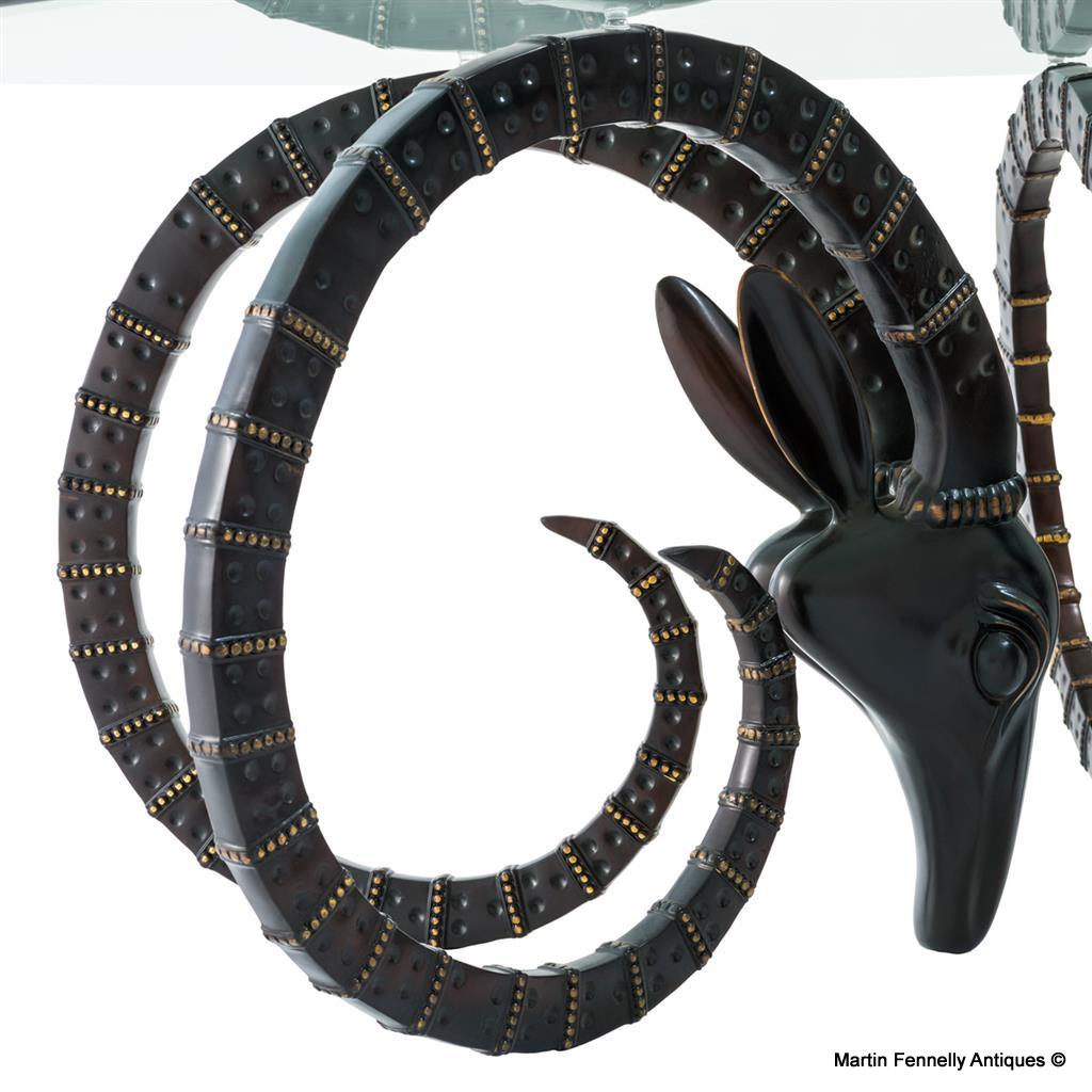 This Ibex themed Coffee Table is very much after Alain Chervet and is made with a sophisticated bevelled clear glass top and sits on triple Ibex Antler finished with bronze patination. A perfect table to create conversations in your interior living spaces.