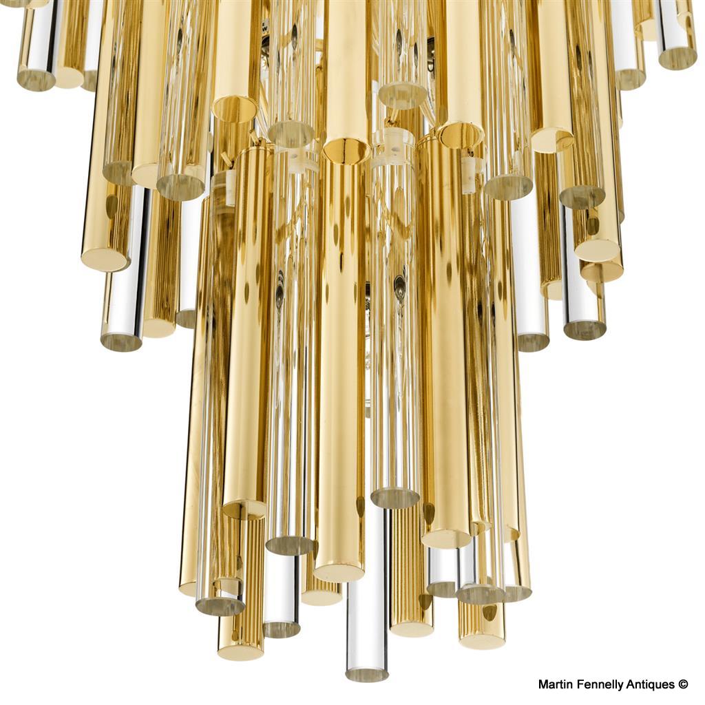 This beautiful Cascade of Crystal and Gilt Rods is in the ‘Waterfall’ design and the style is very much of Toni Zuccheri. This piece crafted by mastercraftsmen exudes a terrific rainbow of light and with the design nod to Art Deco it really fits with the modern design taste. Add some Mid Century Glamour to you room with this spectacular chandelier. Wired, 1.5m of chain and condition is excellent.