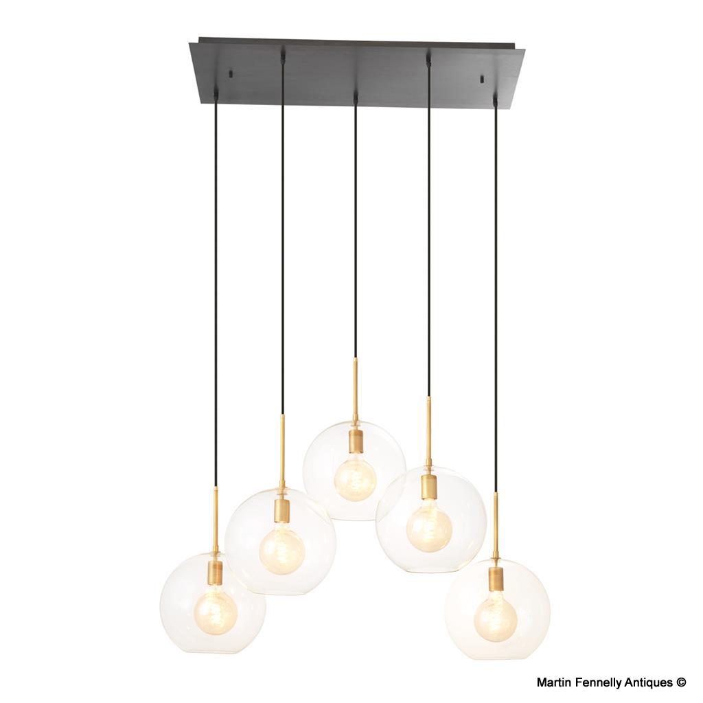 Now this Modern design Chandelier will add some classic grandeur to that modern home interior with its fabulous 5 globe lights and consisting of five globe clear glass with antique brass finish frames on long delicate cables. Look really good when paired with a selection of decorative filament light bulbs in each lamp. The whole look is adjustable, very adaptable and will definitely draw admiring glances from visitors to your home. Finished with an Antique Bronze finish.