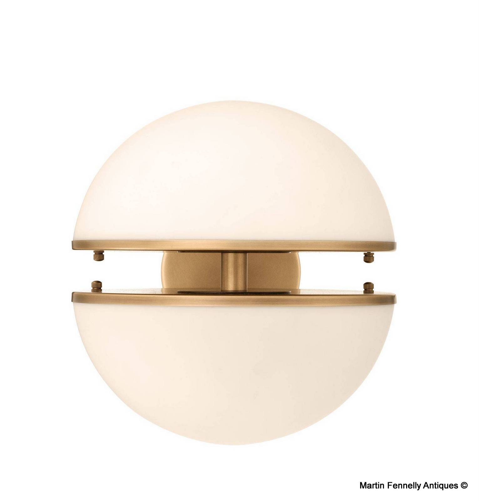 Pair of Spiridon – These are a wonderful Pair of Wall Lights Inspired by futuristic designer lighting from the 1960s, the Spiridon Wall Lamp exudes Mid-Century Modern appeal. The fixture features an antique brass finish and the lampshade is formed by two half spheres from white glass with an open space in between.