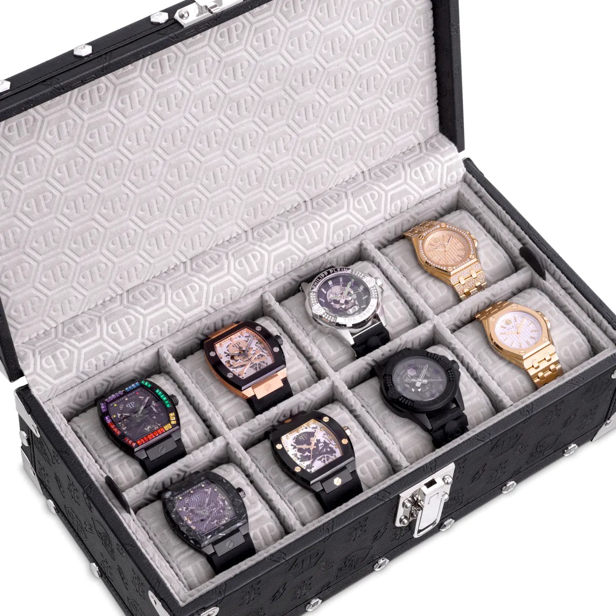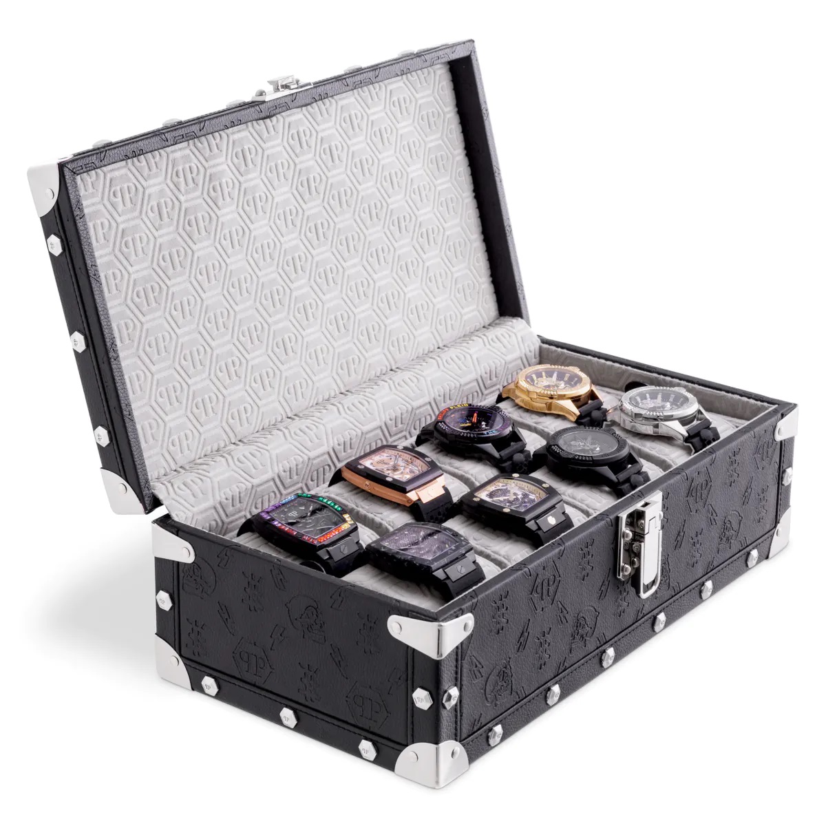Watch collecting is a big pastime for many these days and presentation is everything (apparently) so it was no surprise that one of the World’s most famous designers, Philipp Plein, designed the No Limit watch box for showcasing up to eight timepieces. Crafted with black PVC and lined with custom PP logo velvet, the box is finished with nickel finish detailing. I always like to have high quality Jewellery Boxes in my Gallery so this Watch Box which is wonderfully constructed and designed fits well with my inventory.