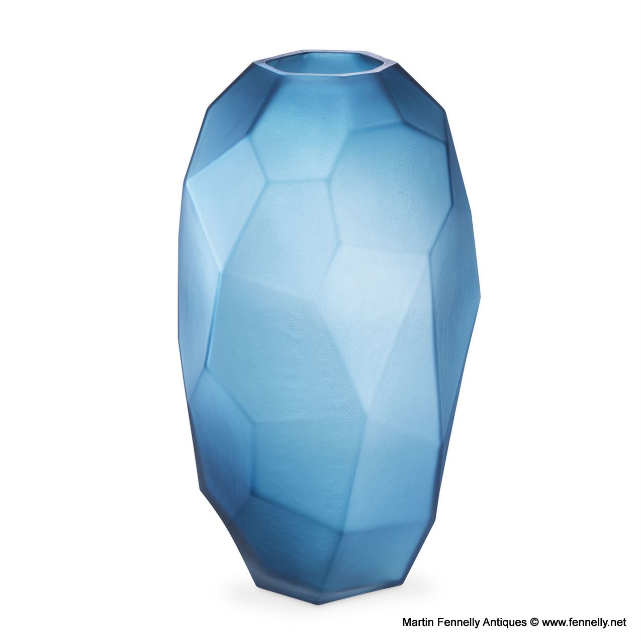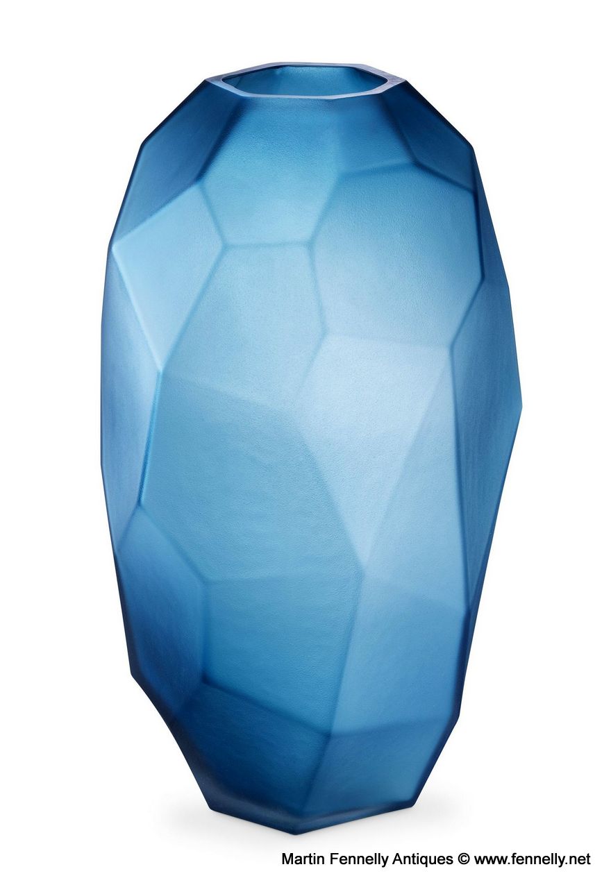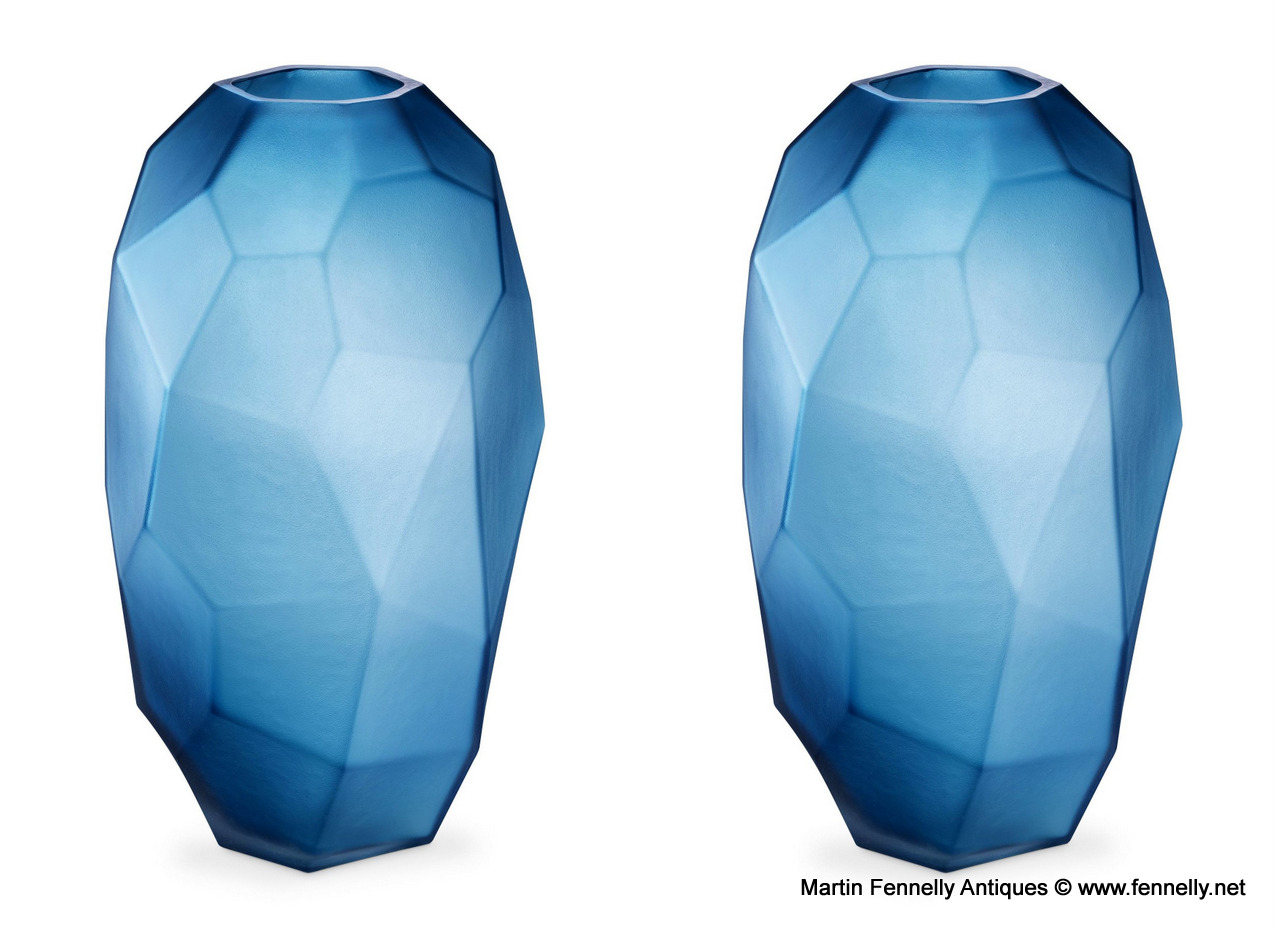 This Pair of modern design ‘Fly’ Vases with geometric planes and a matte blue finish make a stylish accent for any table, mantel or shelf. Hand blown by skilled artisans, each piece is totally unique. In these uncertain times these will add a flourish of colour and drama to your interior space.