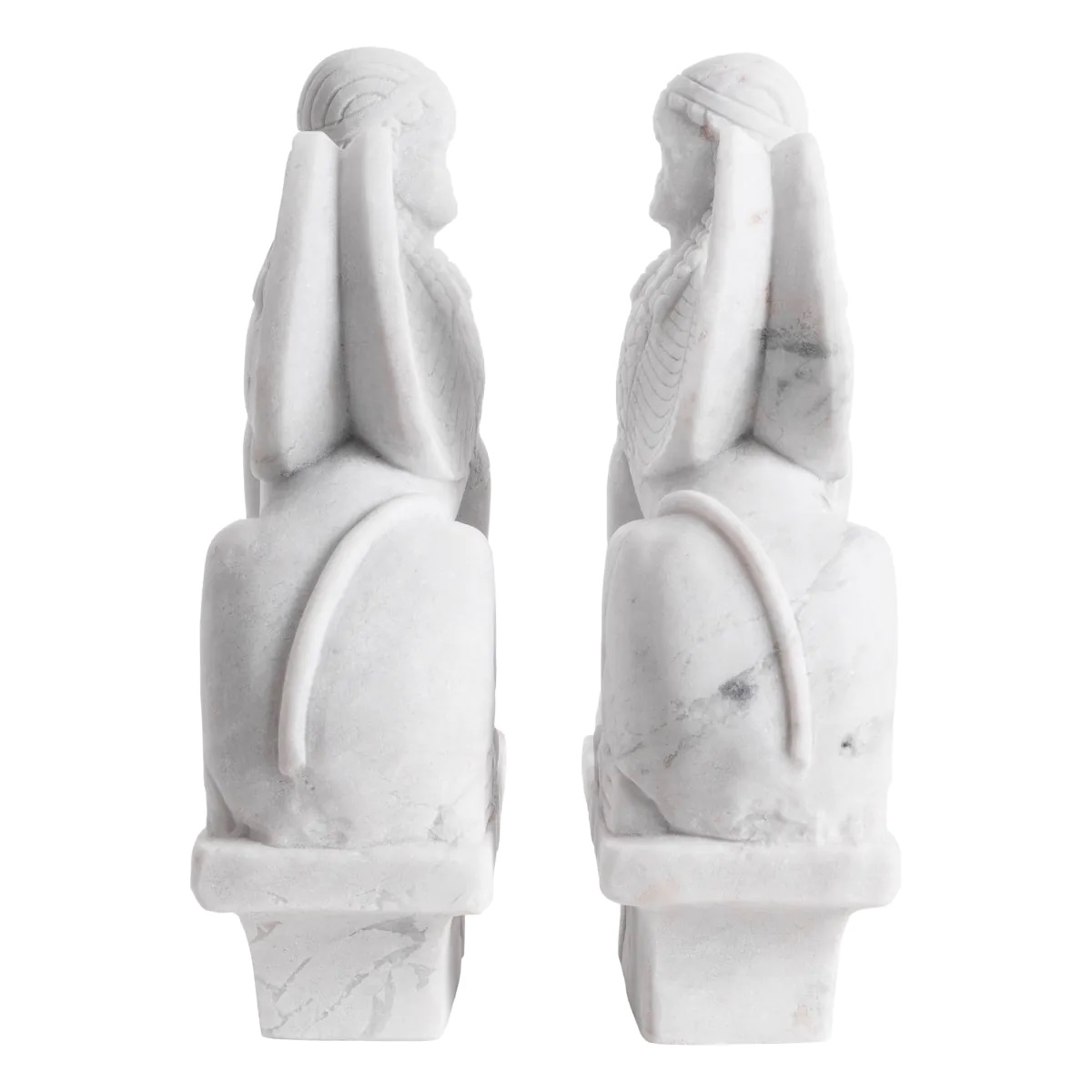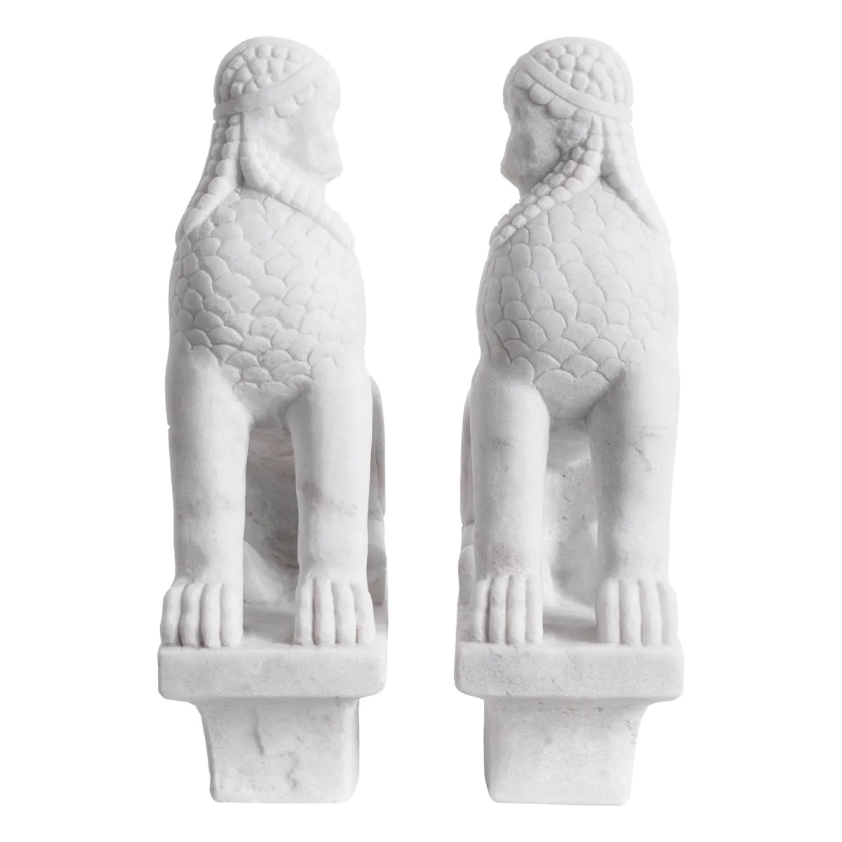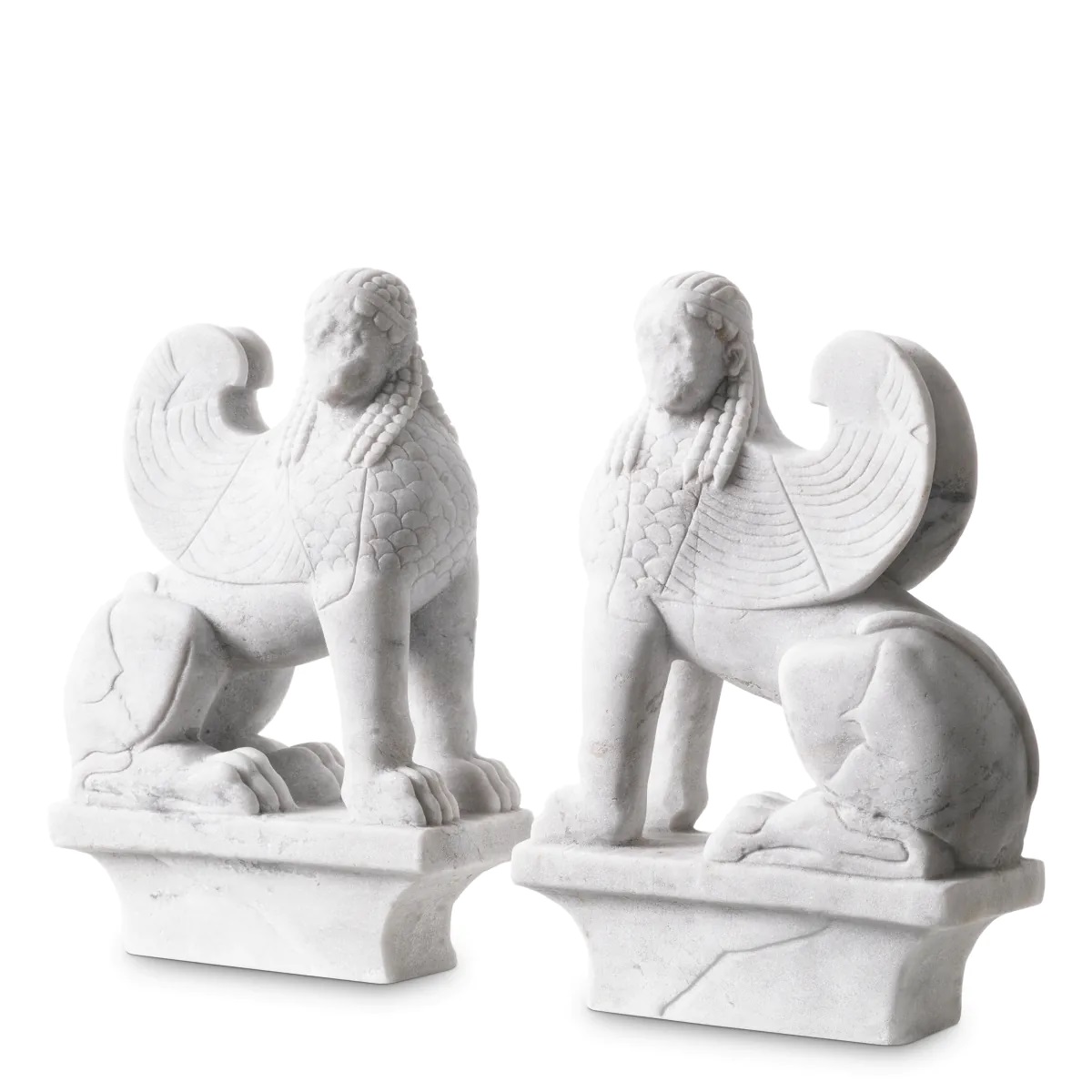 Pair of Marble Sphinx which are hand carved in Marble. Brings the mystique of ancient Egypt to your interior space. Crafted from white marble with meticulous handwork, each piece is unique, marked by variations in color and veining. This set is a testament to the early Archaic period’s fusion of Greek and Egyptian sculptural styles, bearing the same stylized features and architectural influences. The Sphinx Set of Two is inspired by a marble sphinx (ca. 580–575 B.C.) on a cavetto capital—its carved, curved base—dating back to Greece’s Archaic period. The marble sculpture, now in the collection of The Metropolitan Museum in New York, once topped the tall grave shaft of a young man named Philinos or Thalinos, and belongs to the earliest type of grave stele produced in Attica during the 6th century B.C. Let this Pair by Eichholtz stand as guardians of history and beauty in your home.