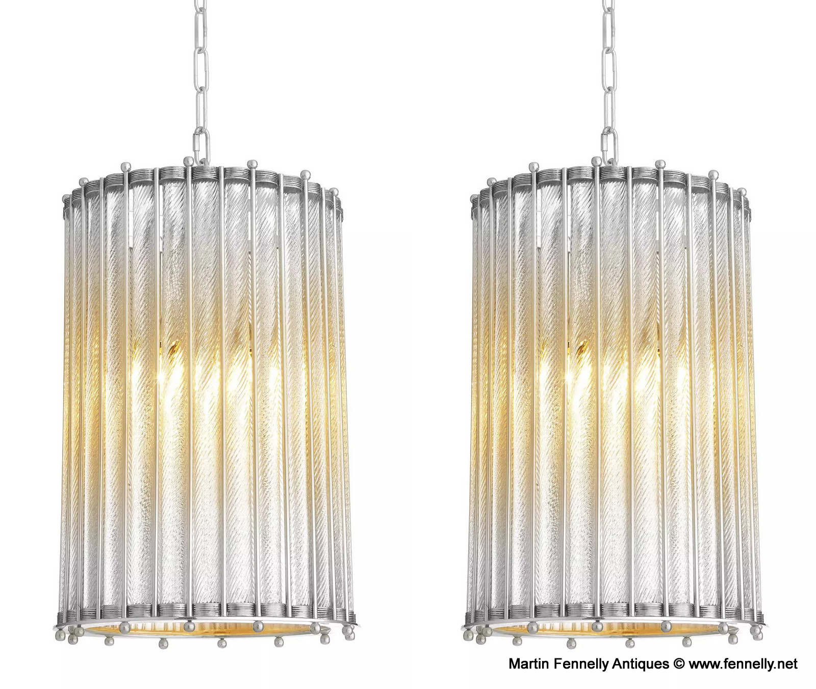 Invite the gorgeous aesthetic of the Tiziano Lantern into your home with this Superb Pair. By pairing vintage-inspired lattice and finials with contemporary design, these refined pendant lanterns exude timeless appeal. The antique silver plated drum shade features hand sculpted glass rods which when illuminated create a stunning lighting experience which are sure to draw admiring glances from visitors to your home. These lanterns come wired and ready for installation with 200cm of matching chain and ceiling cup.