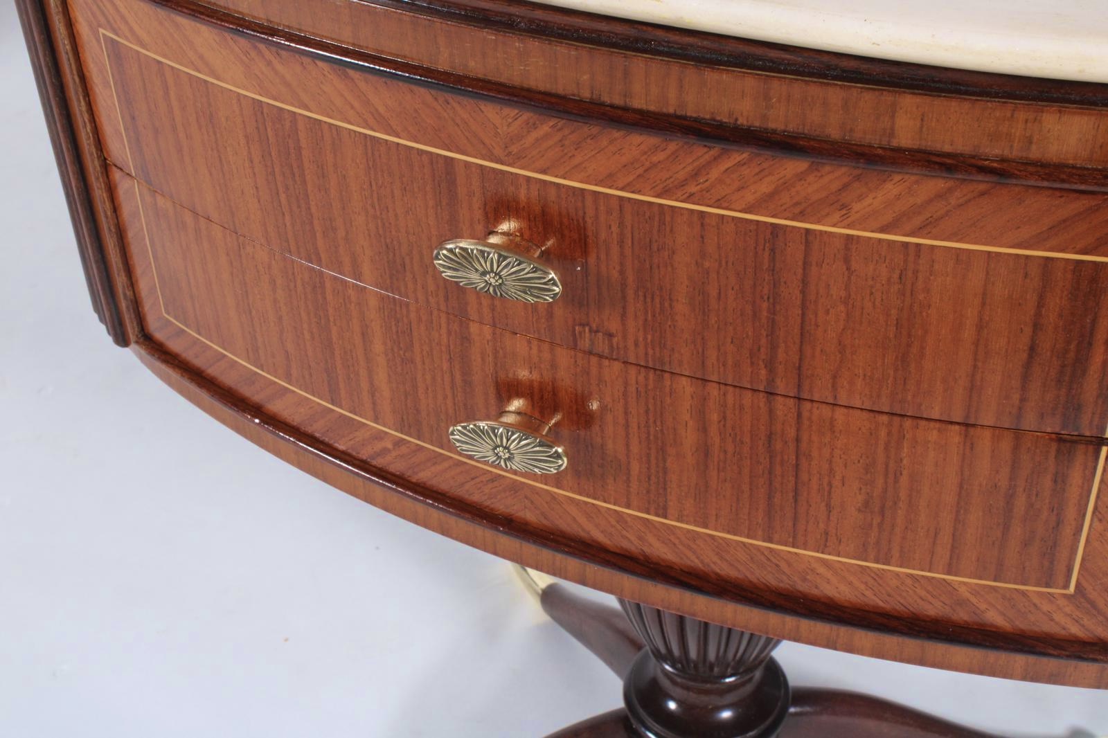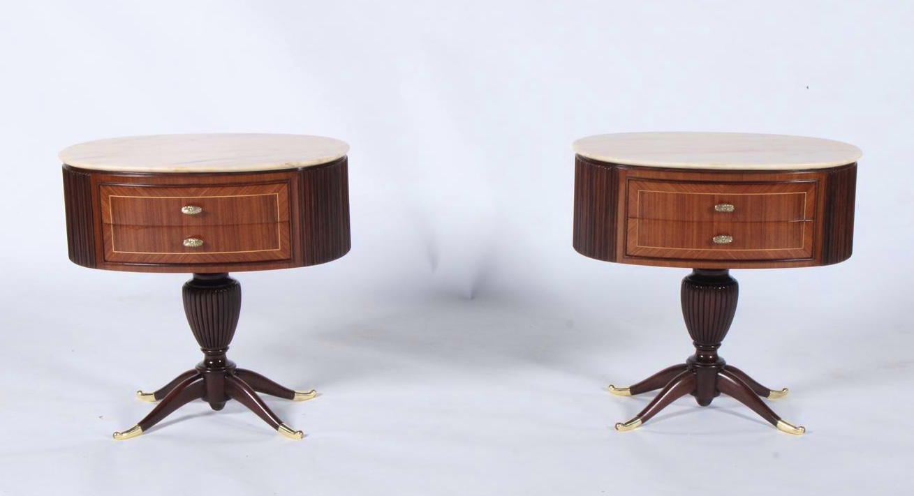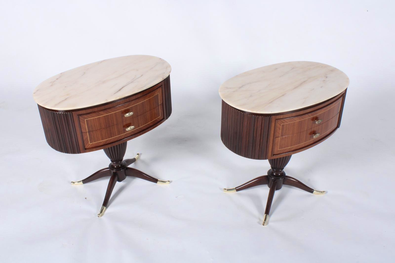 These are a Superbly designed Pair of Cabinets by La Permanente Mobili Cantù (stamped) dating to Circa 1950. This pair in Rosewood, Marble topped, Reeded sides and raised on a central reeded column which is supported with four spreading legs and original sabots. Mobili Cantu were famed for thier professionalism and their willingness to conbine old classical design with the modern thinking of Gio Ponti and Poalo Buffa. They have twin drawers and Carrara marble top which are original. These are really beautiful and Stylish.