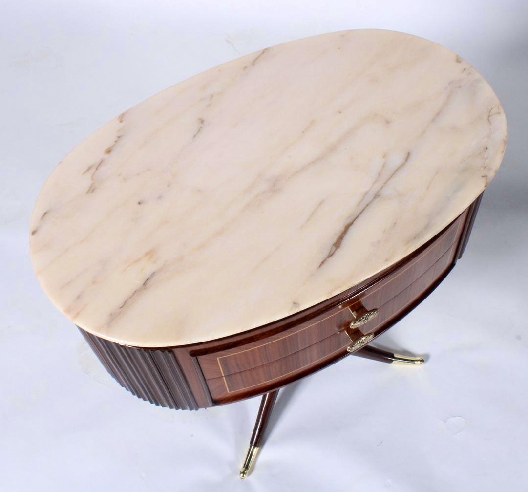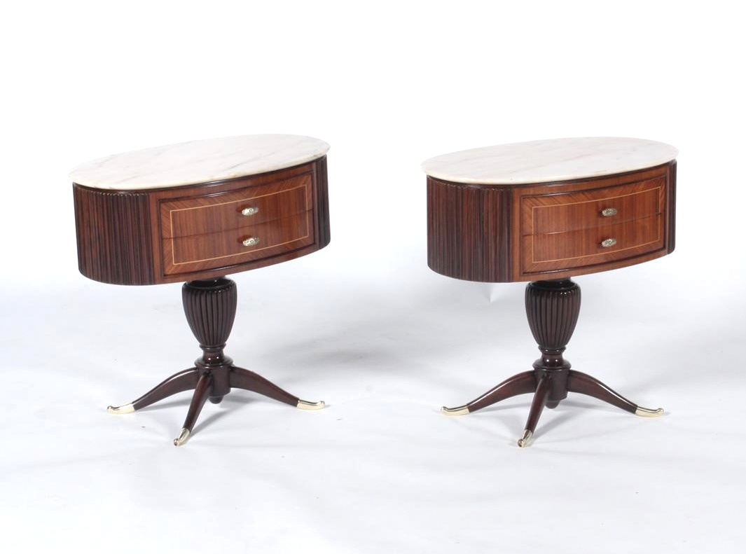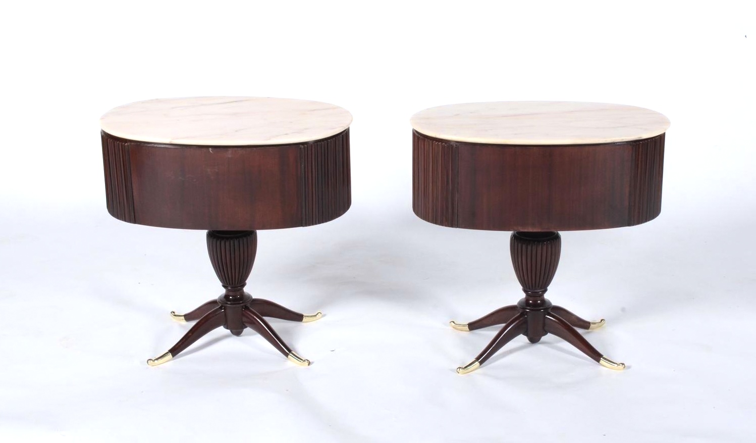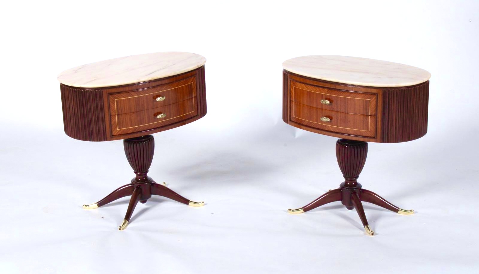 These are a Superbly designed Pair of Cabinets by La Permanente Mobili Cantù (stamped) dating to Circa 1950. This pair in Rosewood, Marble topped, Reeded sides and raised on a central reeded column which is supported with four spreading legs and original sabots. Mobili Cantu were famed for thier professionalism and their willingness to conbine old classical design with the modern thinking of Gio Ponti and Poalo Buffa. They have twin drawers and Carrara marble top which are original. These are really beautiful and Stylish.
