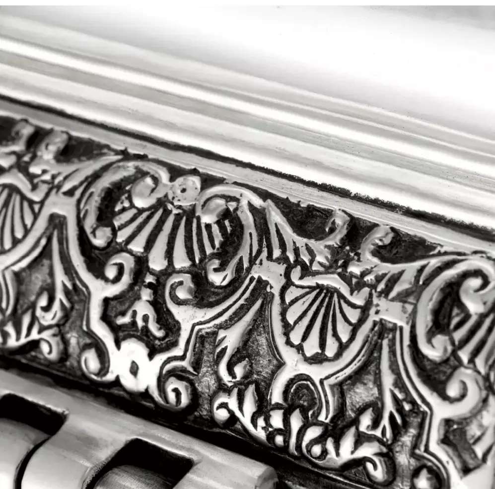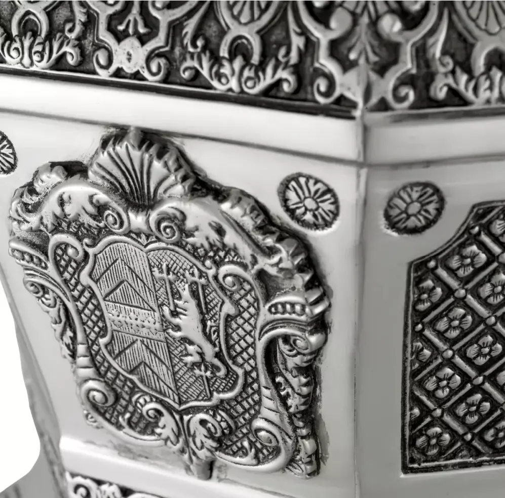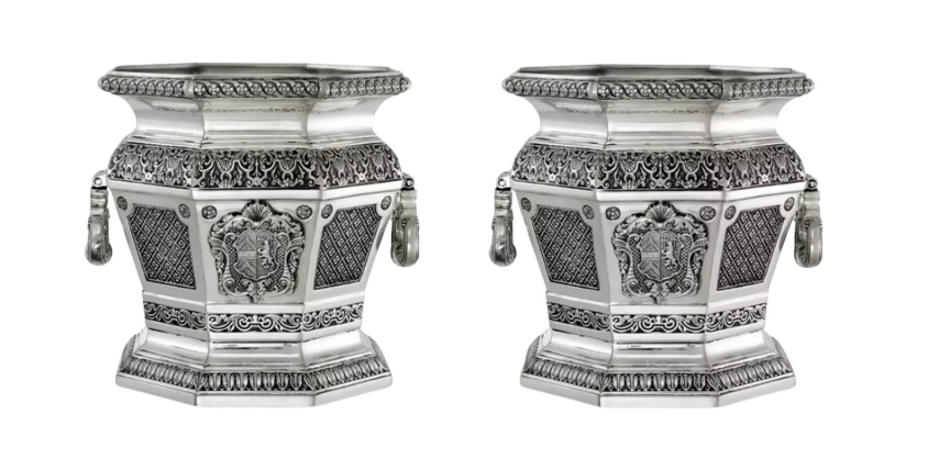 Pair Wine Cooler Walpole, inspired by a pair of silver wine coolers (1716/17) made in the French style by William Lukin I (British, active 1699– ca.1755) for Britain’s first prime minister, Sir Robert Walpole. These contemporary interpretation of the originals wine coolers features a silver plated antiqued finish, blending historical elegance with modern sophistication.