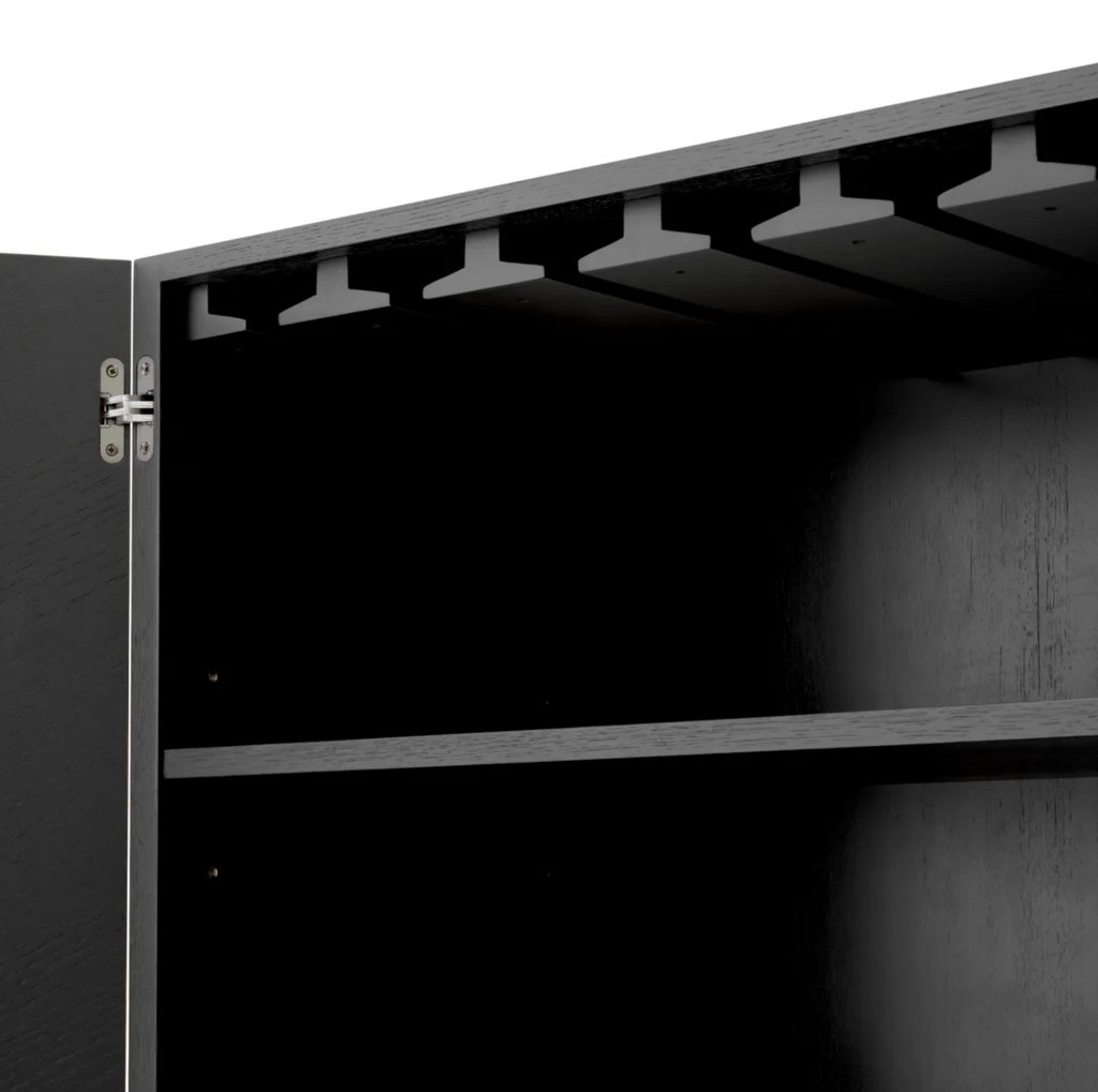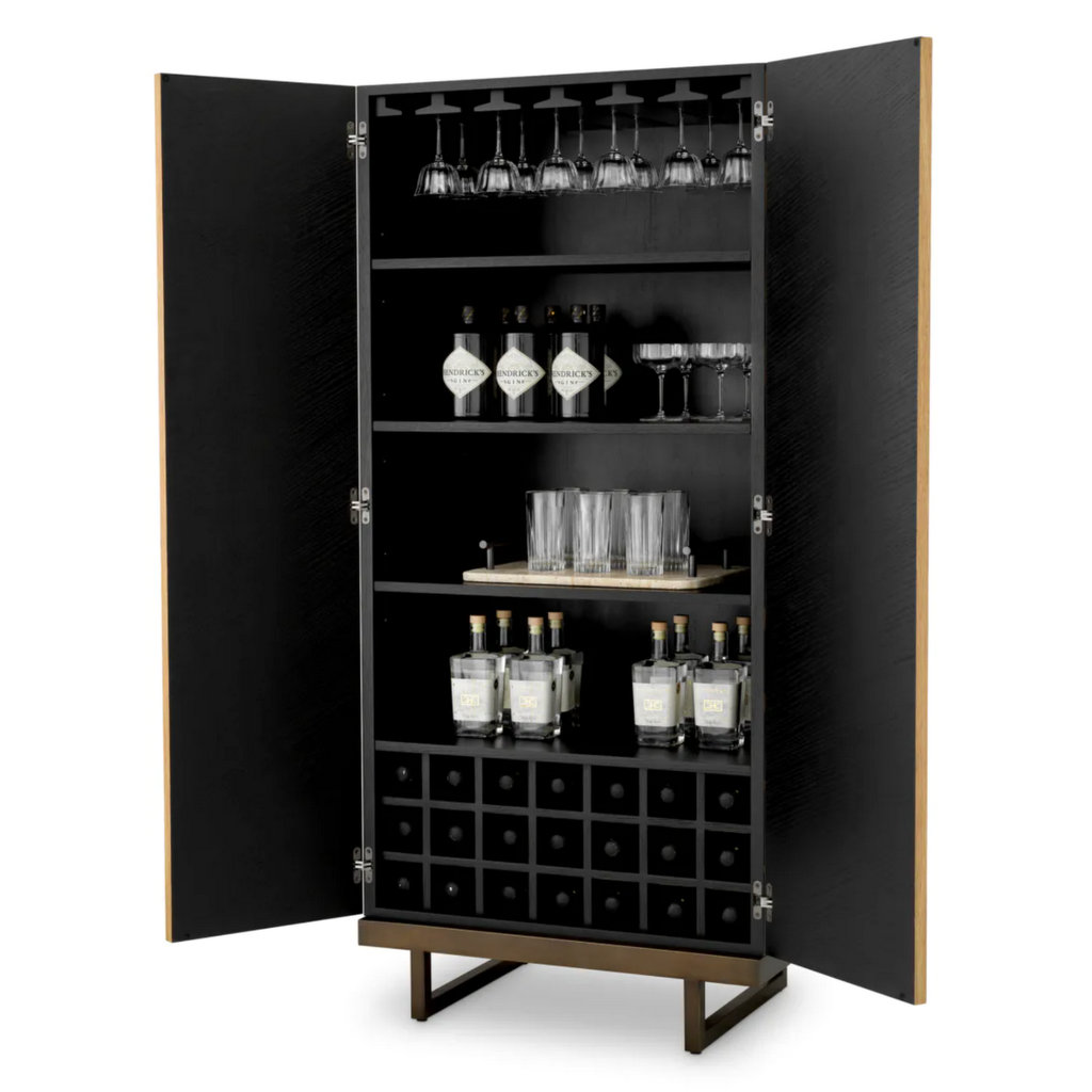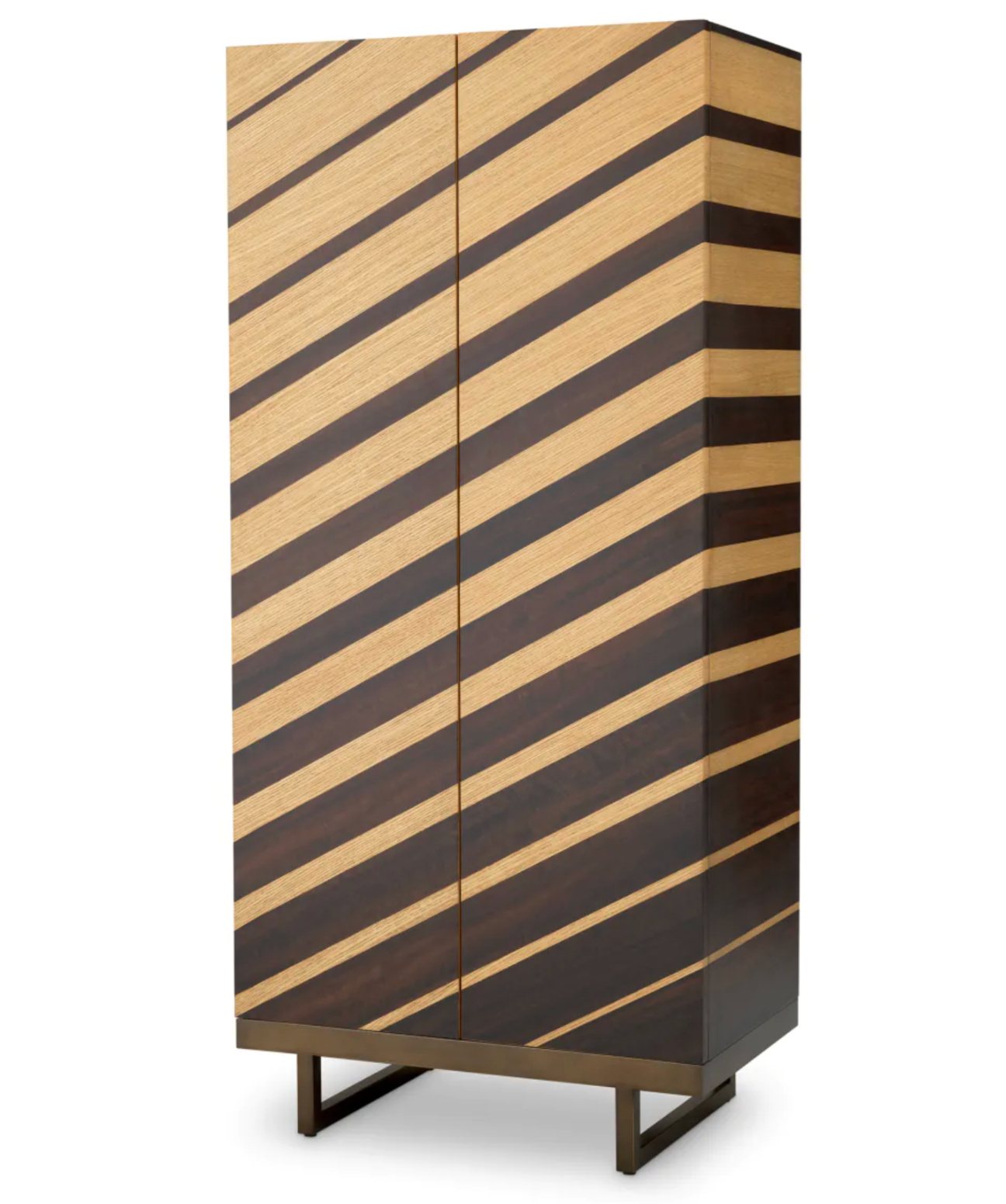 The Wexford Bar Cabinet – Combining the warm embrace of natural oak veneer with the subtle richness of eucalyptus veneer, the Bar Cabinet Wexford showcases a harmonious blend of textures and tones. Behind its elegant doors, the interior offers dedicated space for up to 21 bottles, with plenty of room for glasses and a hanging rack for stemware bringing together smart design and timeless style for effortless entertaining. Eichholtz Design.